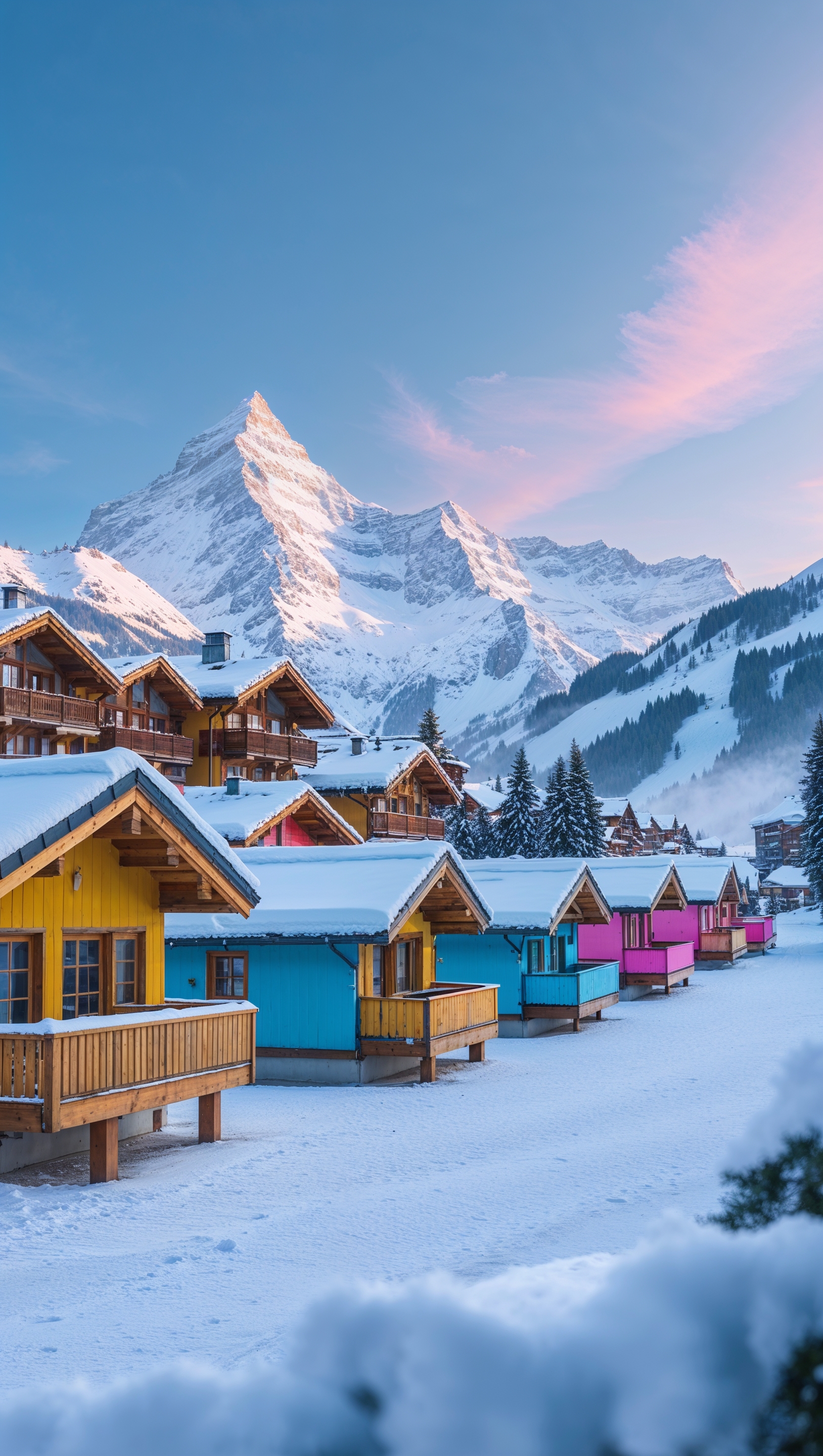 1664x2944 A ski resort in the Alps with colorful cabins, winter morning, iPhone wallpaper