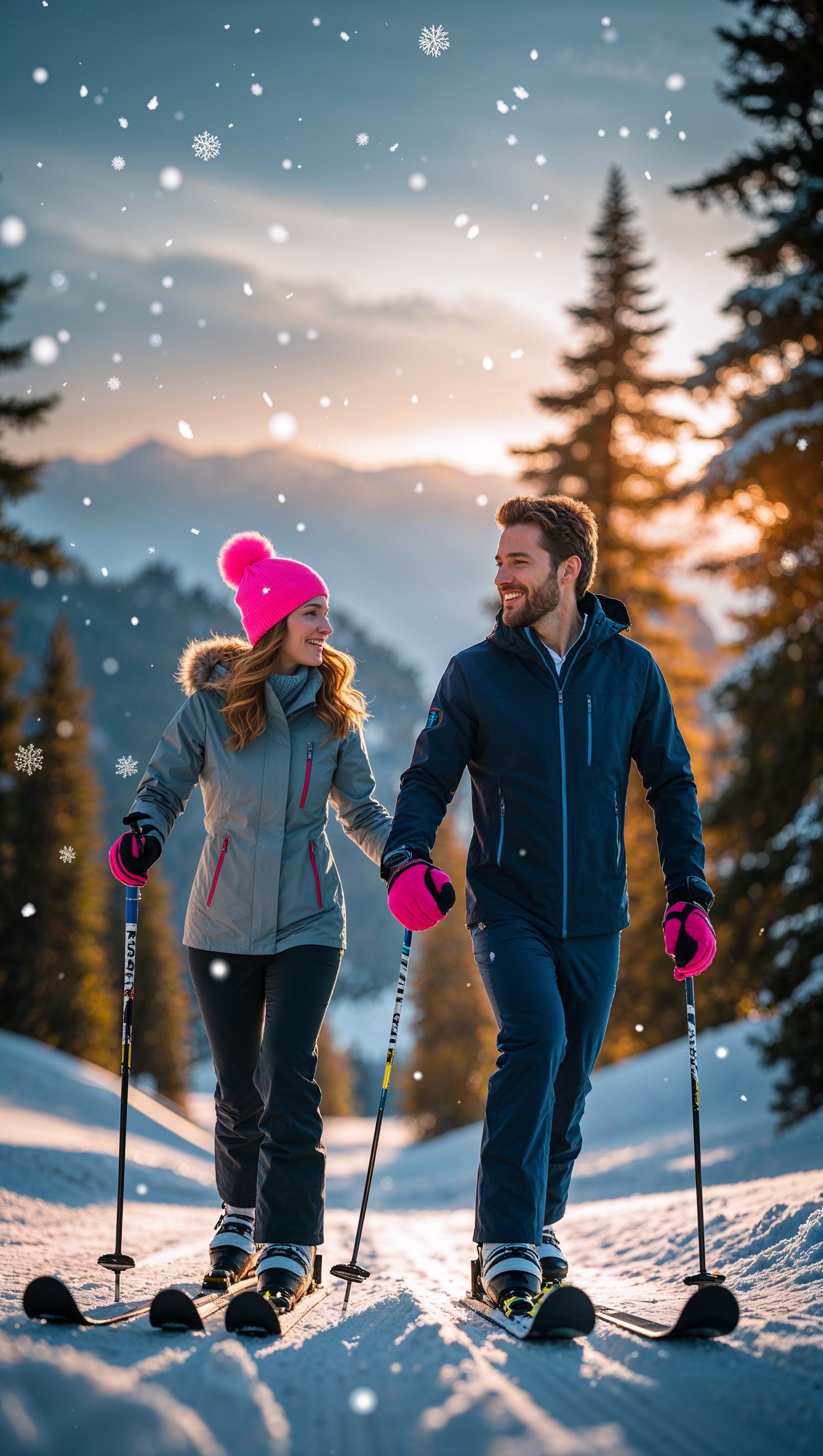 1664x2944 A couple skiing together on a snowy trail, romantic winter scene, iPhone wallpaper