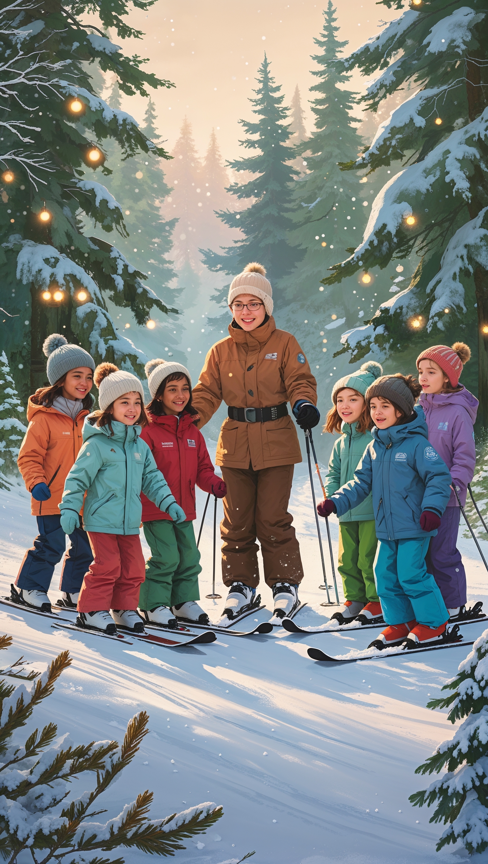 1664x2944 Kids learning to ski in a winter forest, peaceful and soft colors