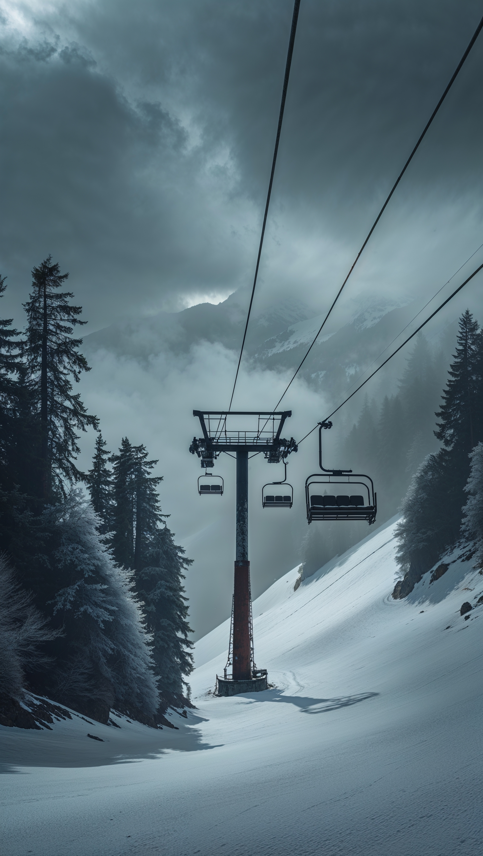 1664x2944 An empty ski lift going up the mountain, moody winter vibe