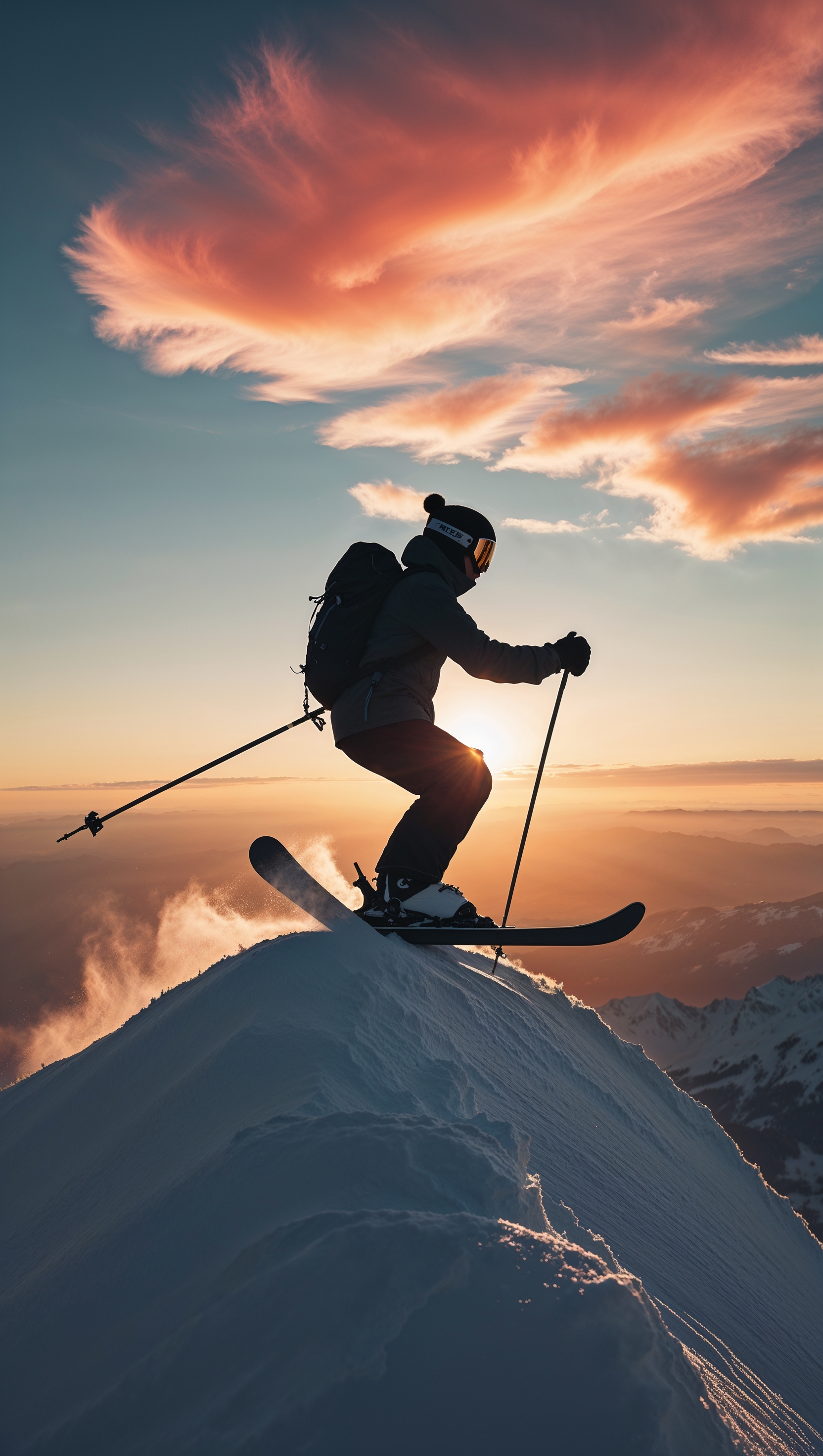1664x2944 A silhouette of a skier during golden hour, warm tones, iPhone wallpaper