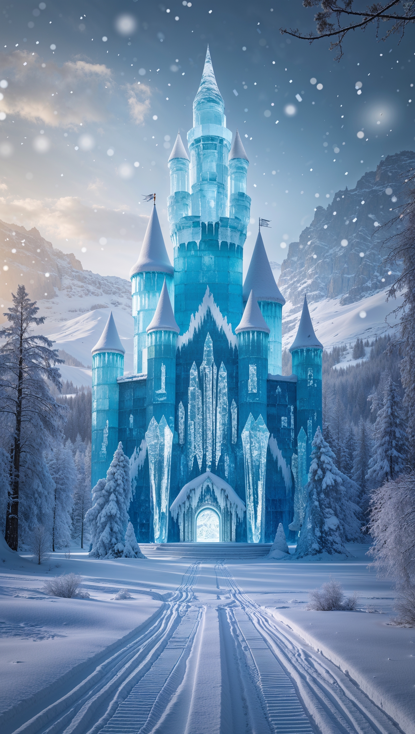 1664x2944 Fantasy ice castle in the mountains with ski tracks, icy blue tones