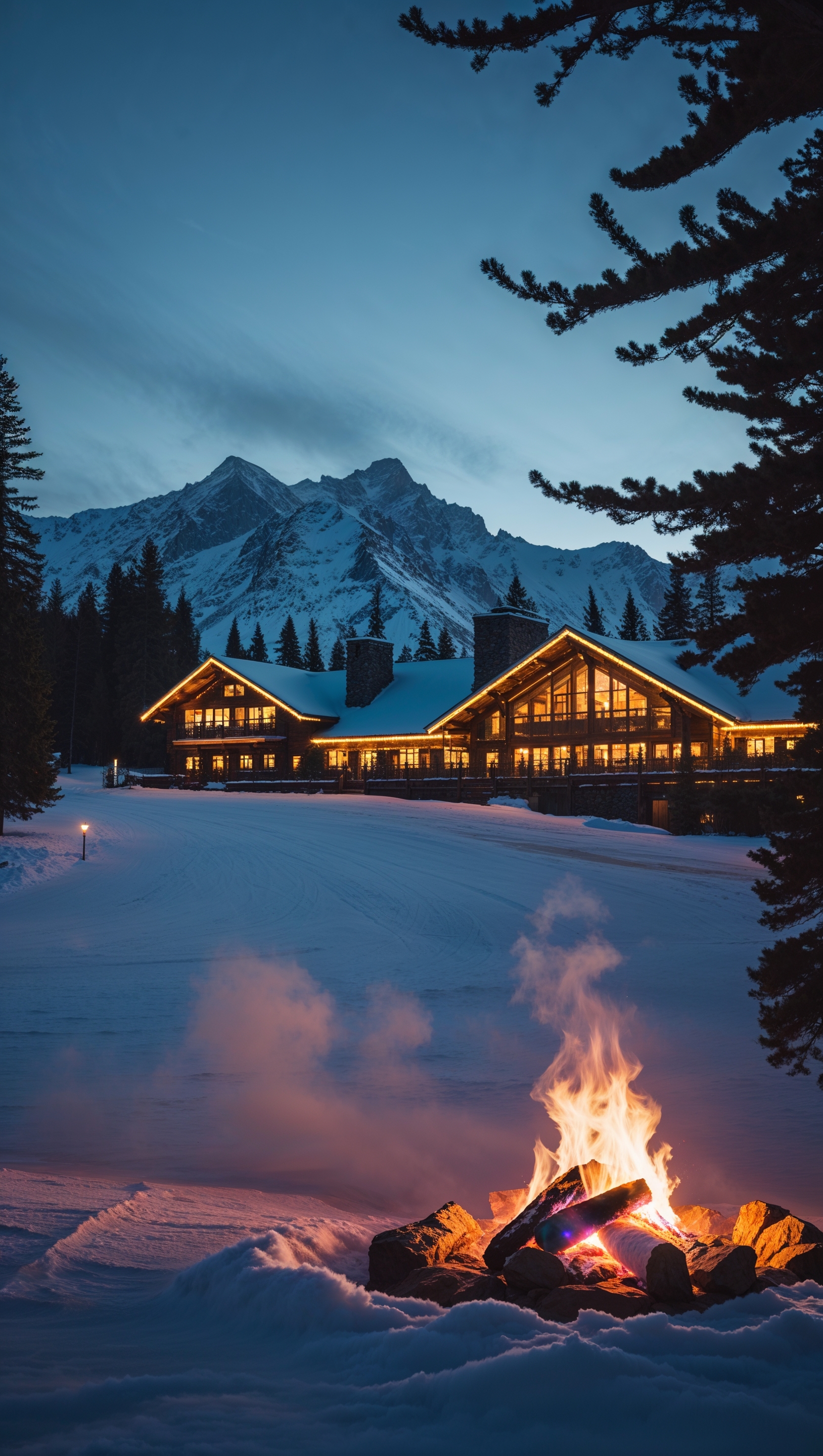 1664x2944 Mountain ski lodge at dusk, warm lights glowing in the snow