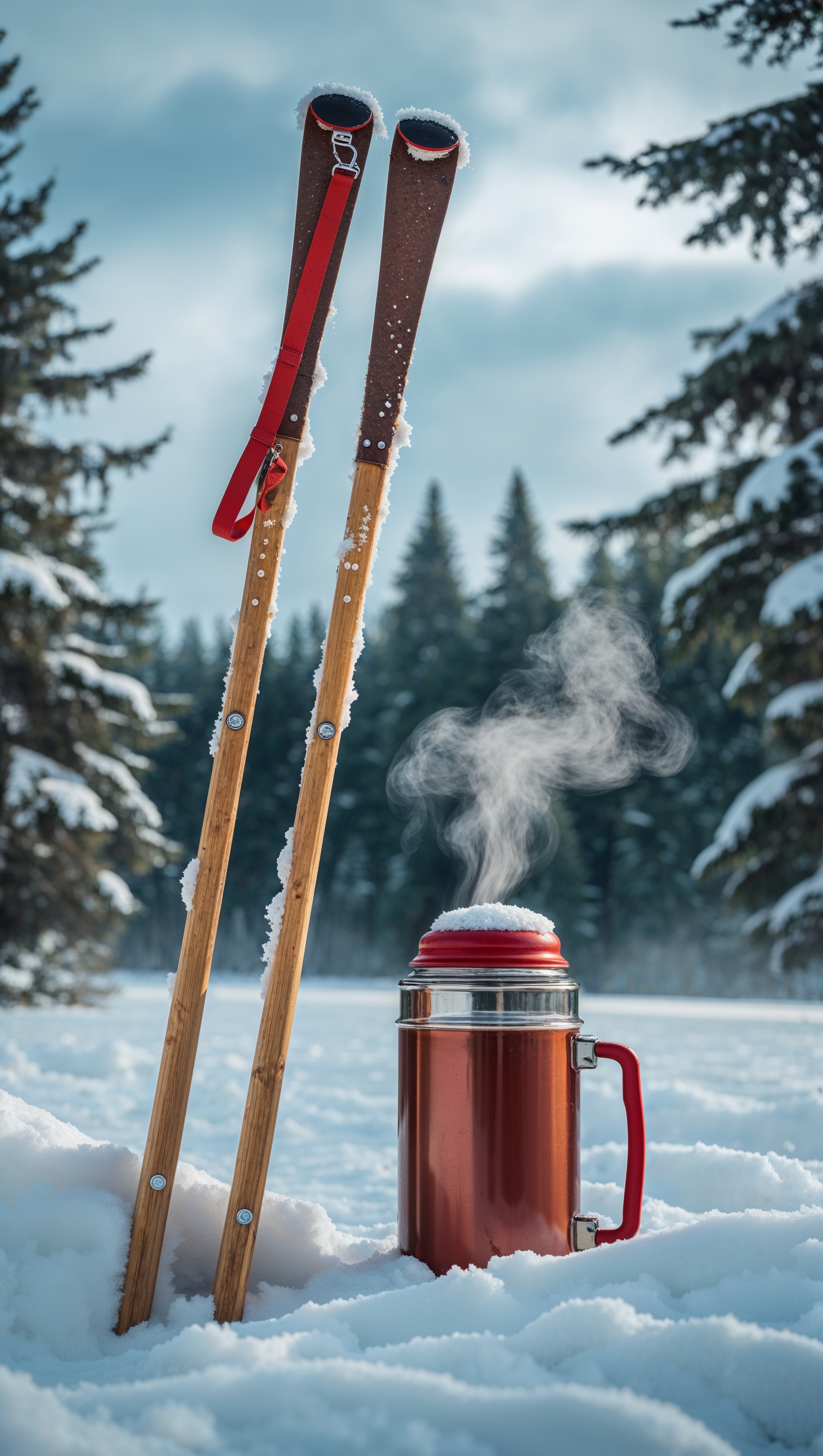 1664x2944 Snowy landscape with ski poles and a thermos, cozy winter vibe
