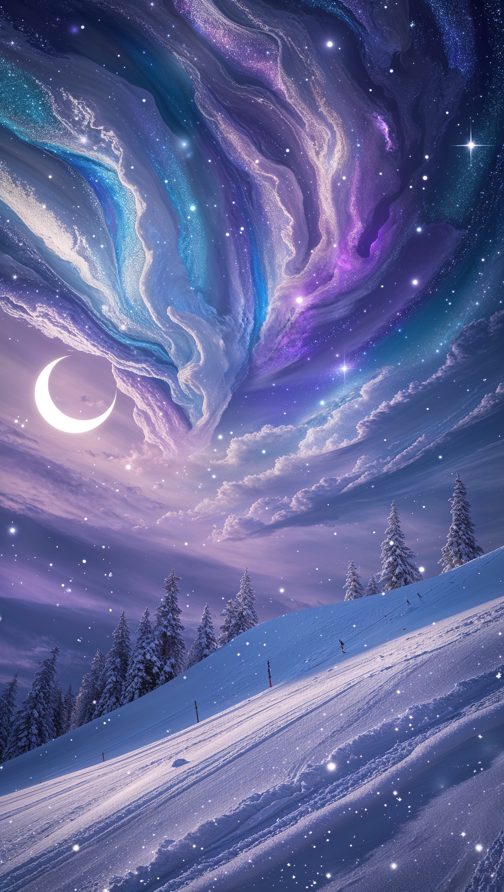 1664x2944 Winter galaxy sky over ski slopes, cosmic fantasy style