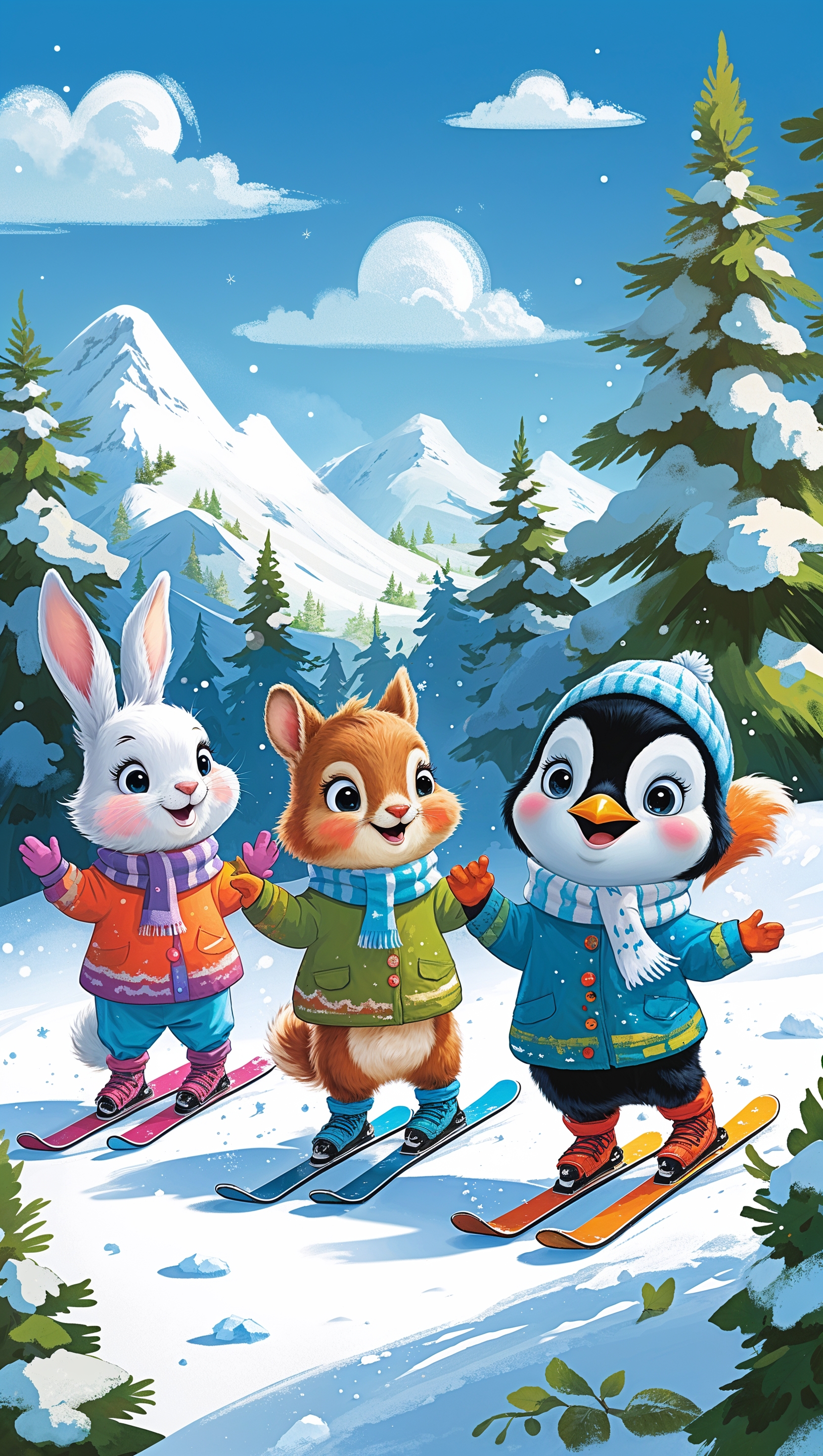 1664x2944 Cute animals skiing in the snow, children’s storybook style