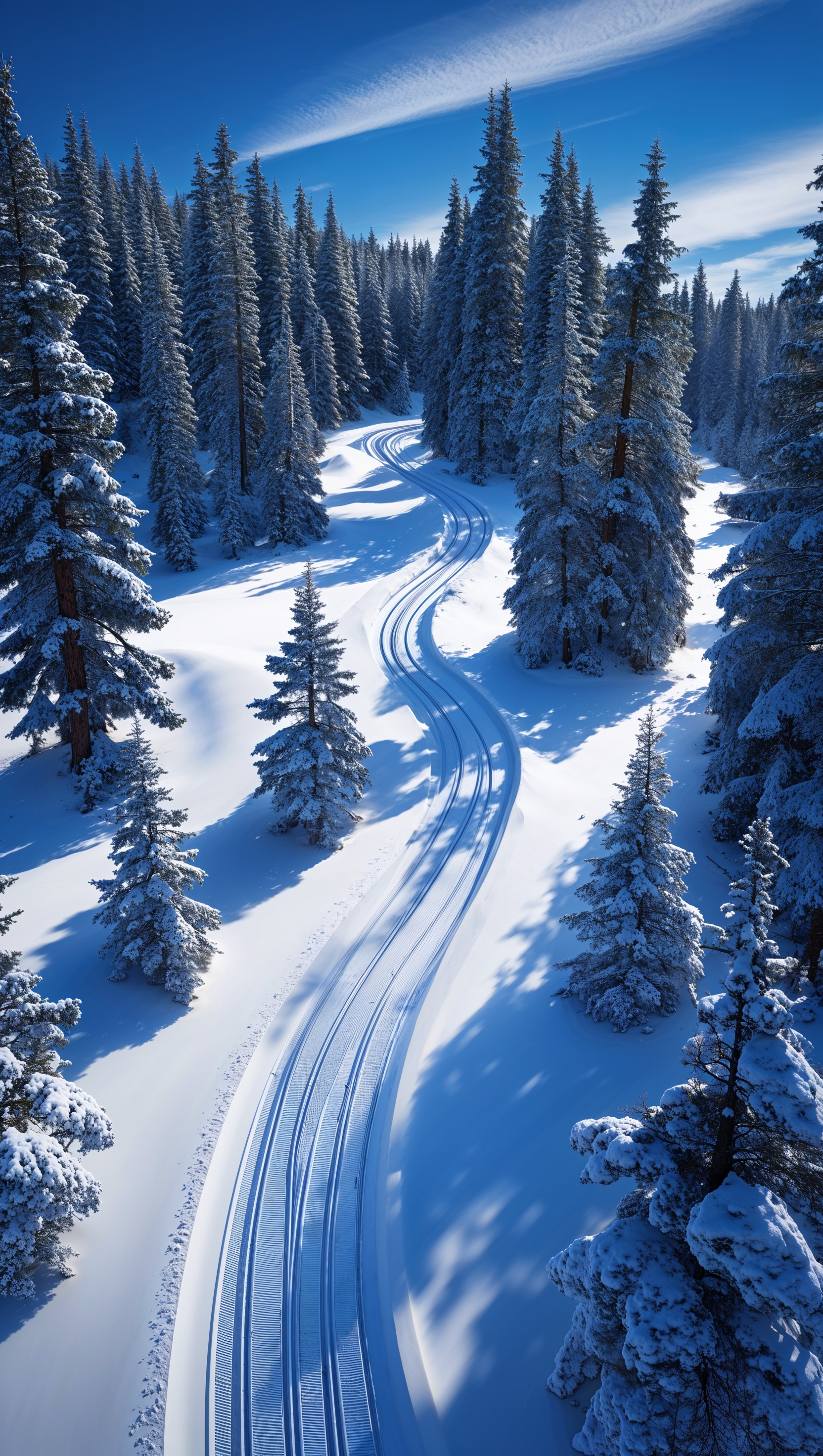 1664x2944 Ski tracks through a dense pine forest, top-down view