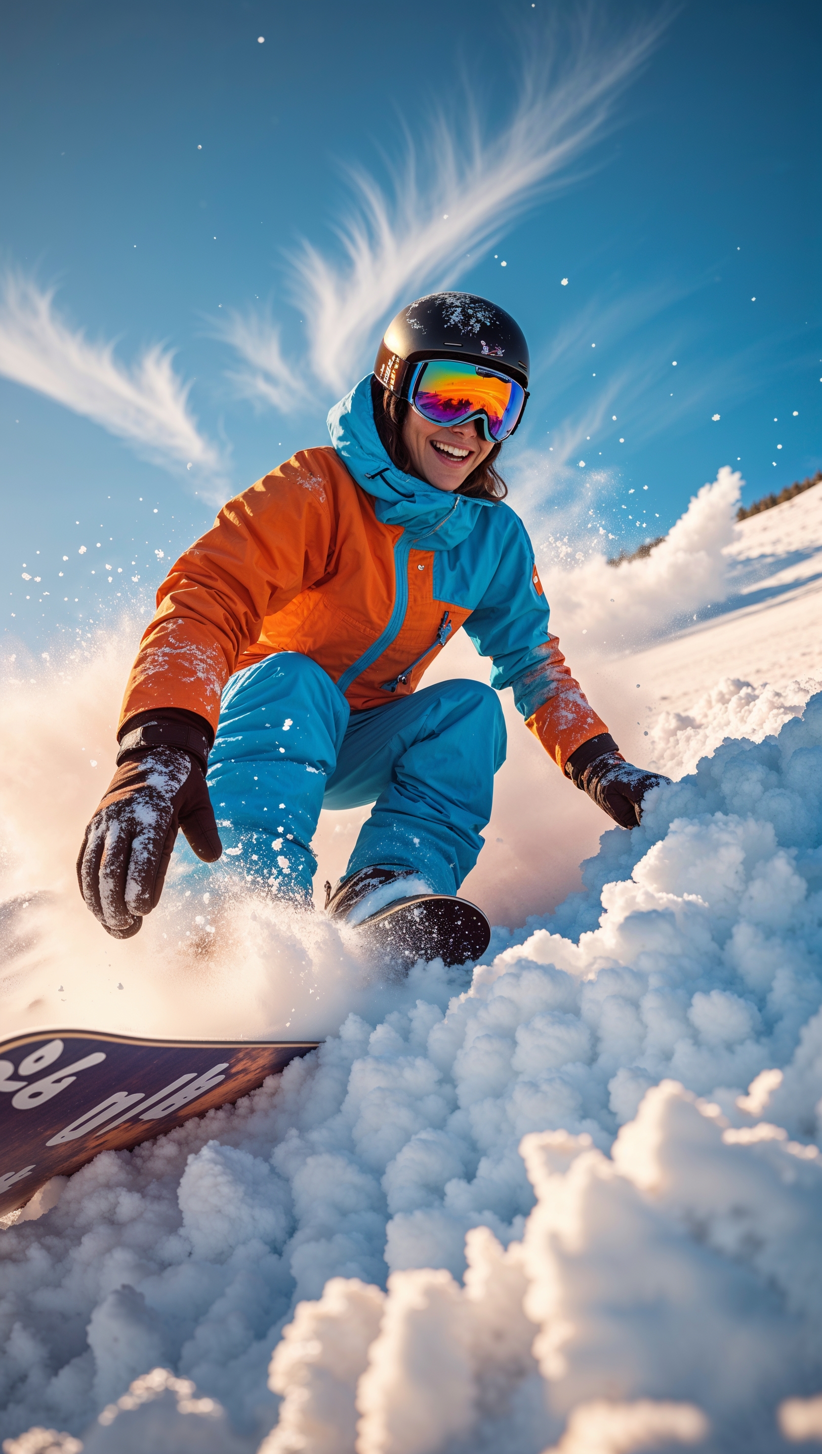 1664x2944 A snowboarder carving through powder snow, slow motion feel