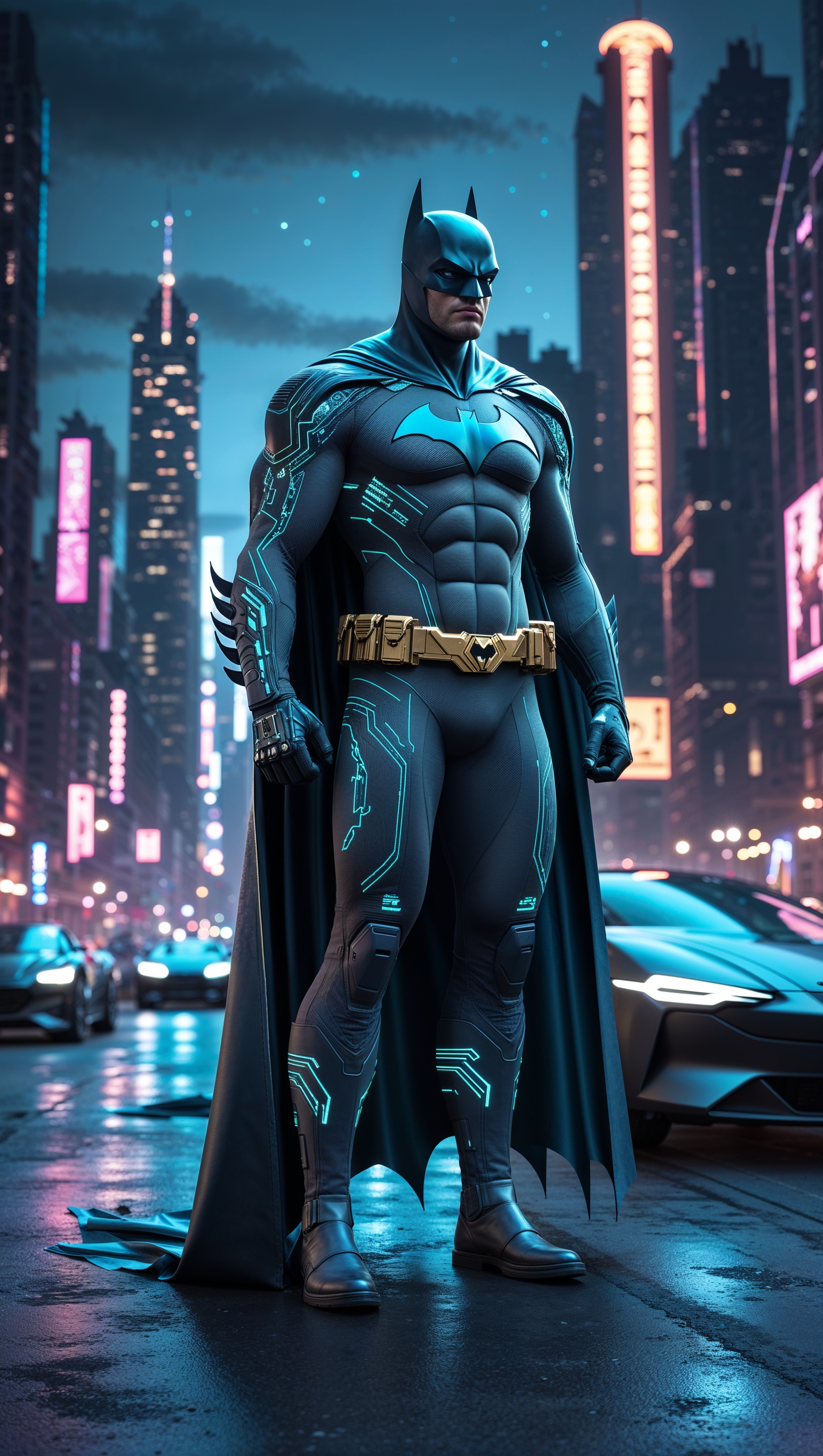 1664x2944 Futuristic Batman in a cyberpunk Gotham with a high-tech suit, 4K iPhone wallpaper