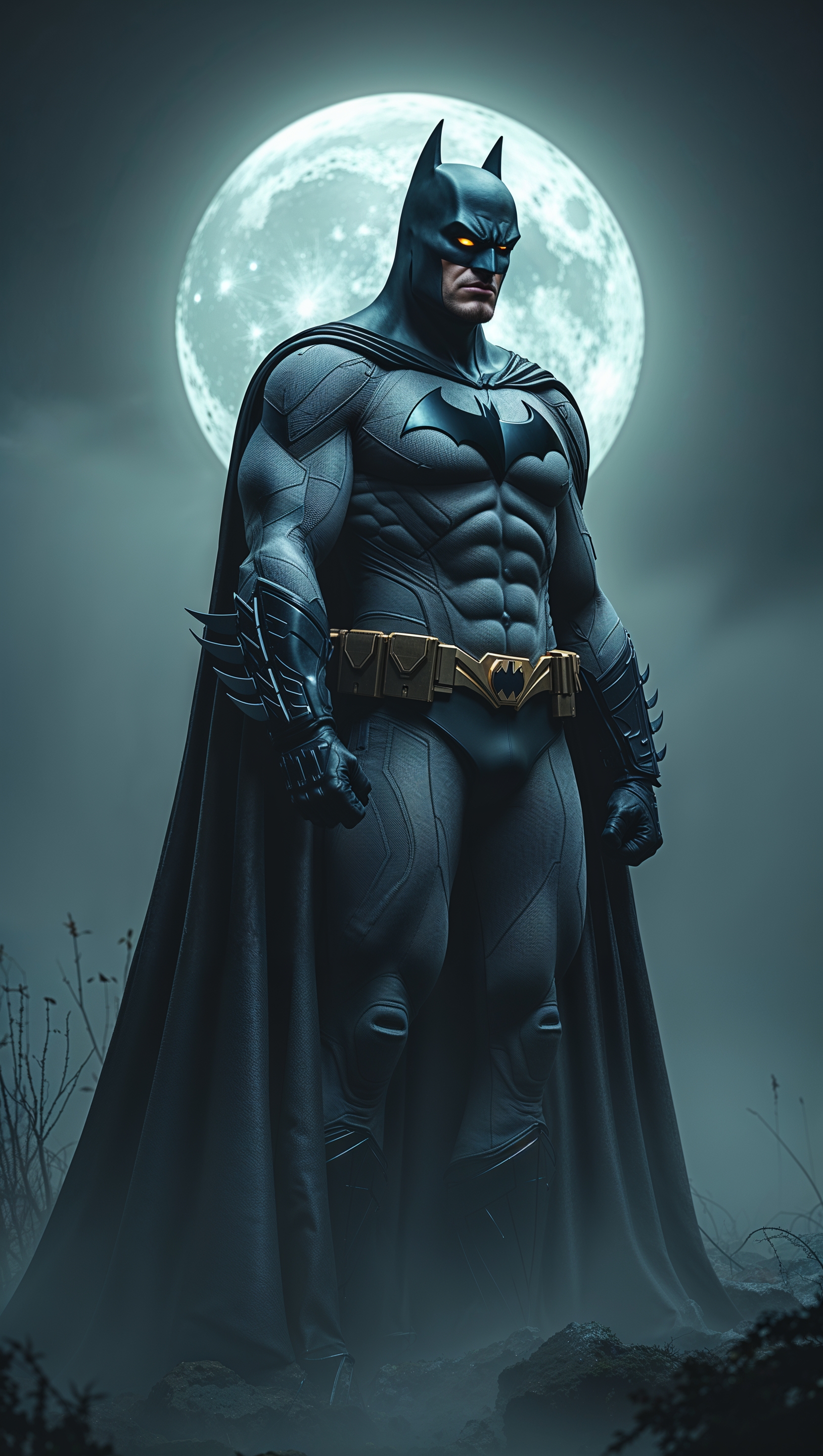 1664x2944 Batman in the night fog with moonlight behind him, 4K iPhone wallpaper