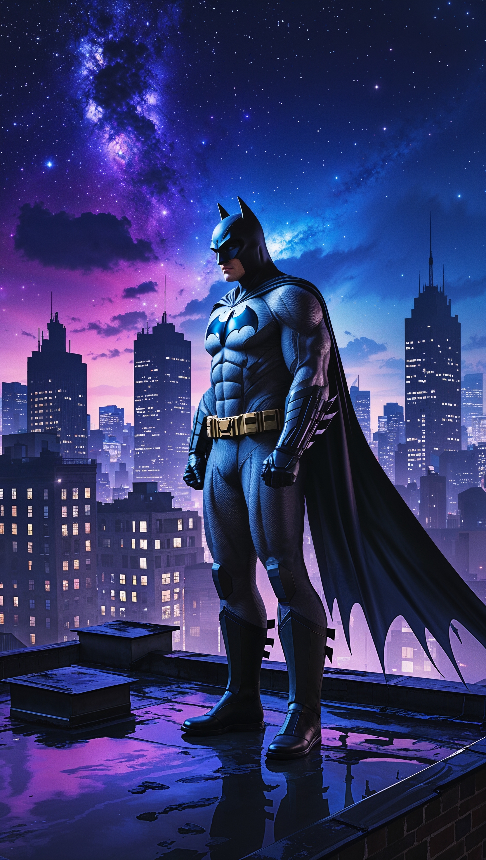 1664x2944 Batman standing on a rooftop at night in Gotham, with a starry sky, 4K wallpaper for iPhone