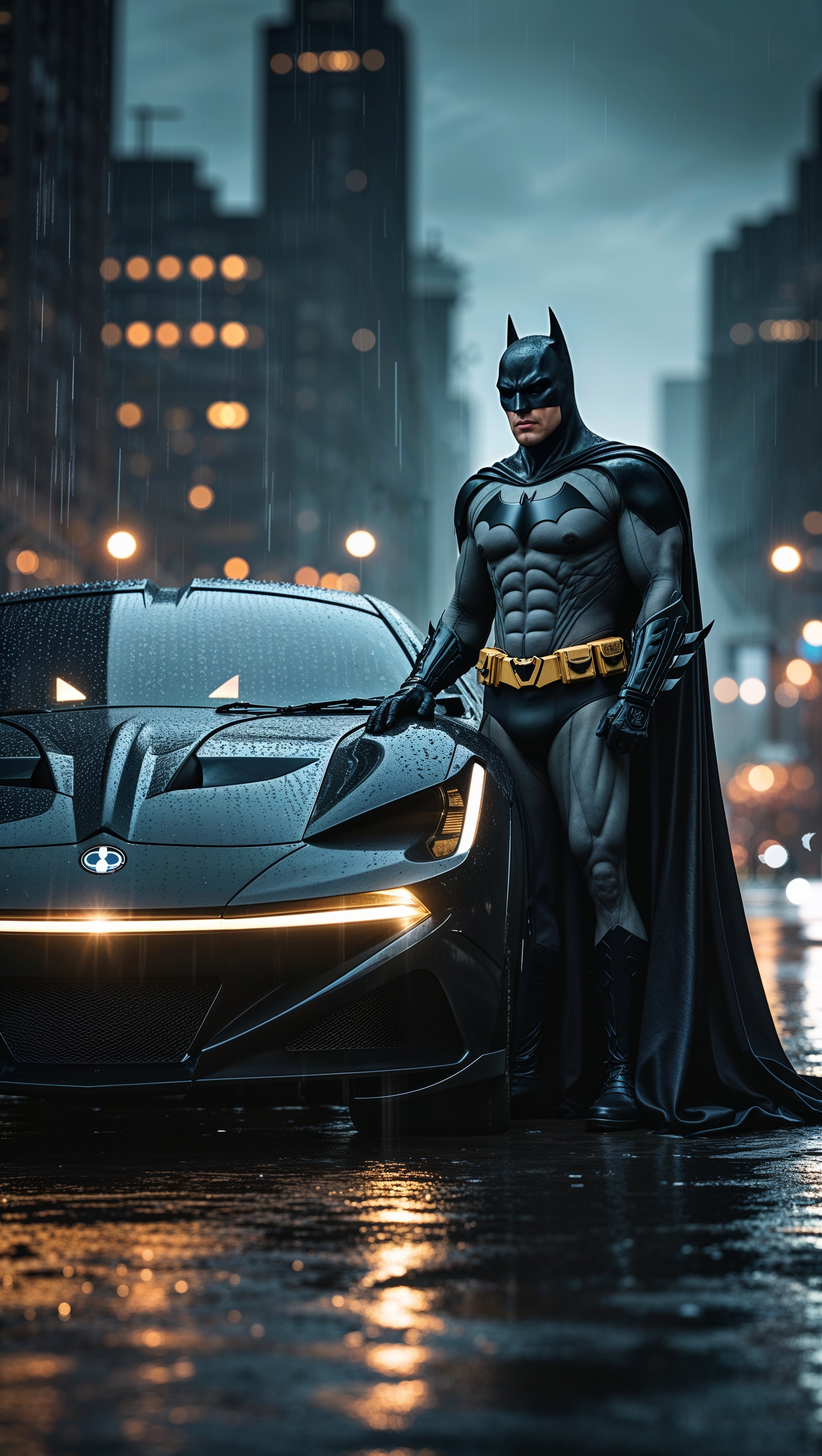 1664x2944 Batman with the Batmobile on a rainy night, 4K iPhone wallpaper