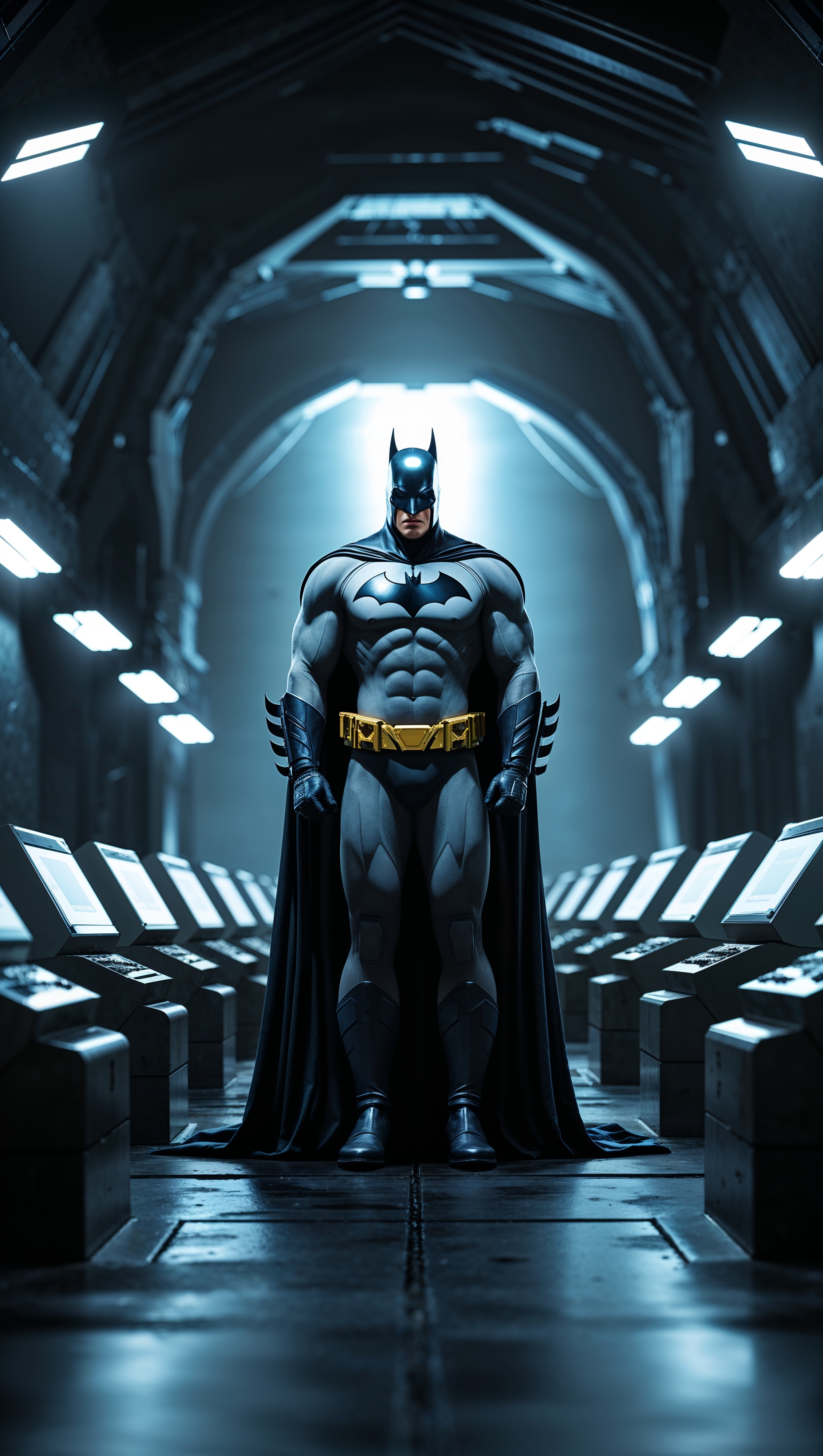 1664x2944 Batman in the Batcave with glowing blue lights, 4K iPhone wallpaper