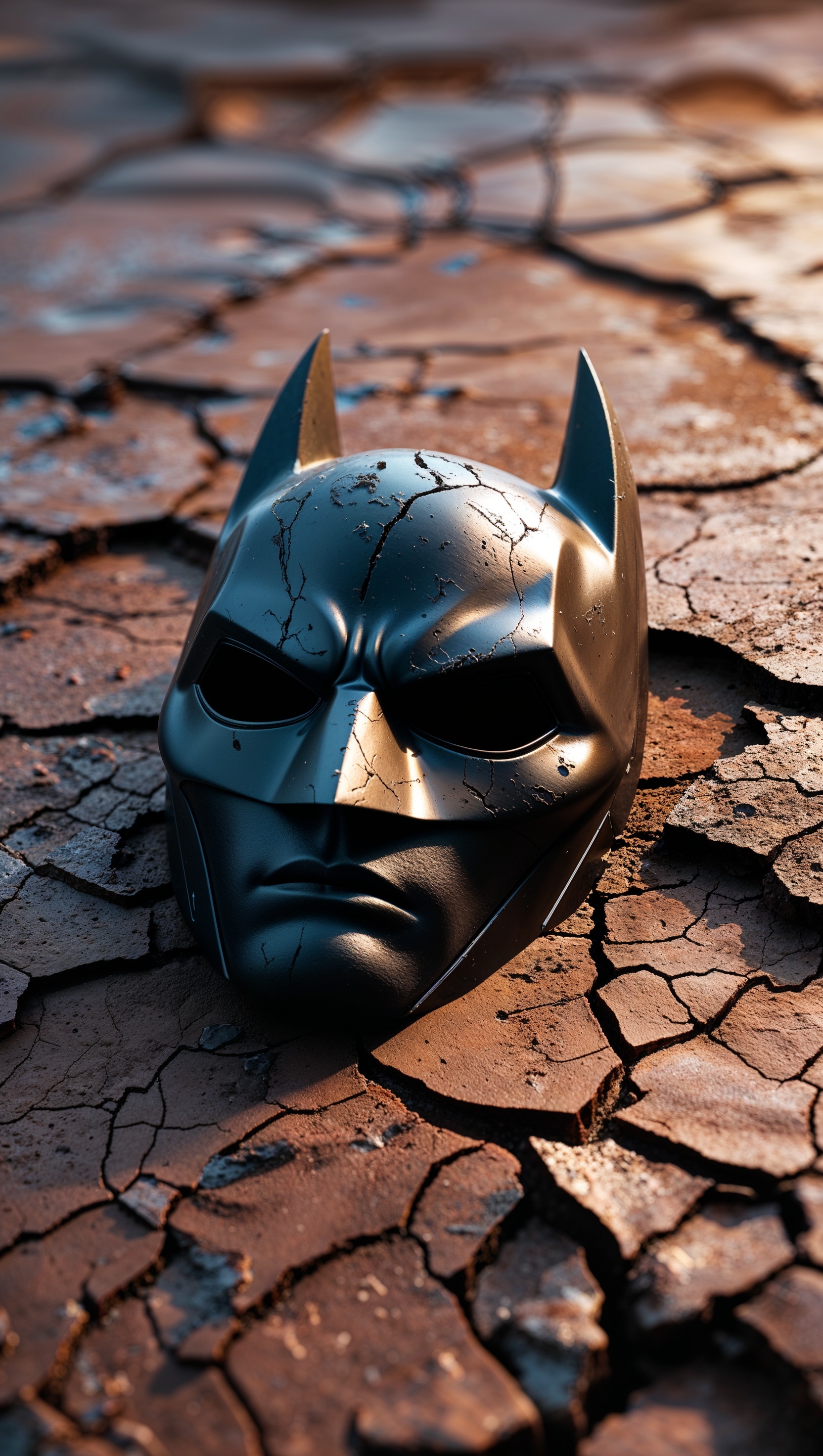 1664x2944 Batman’s mask on cracked ground, dramatic angle, 4K iPhone wallpaper