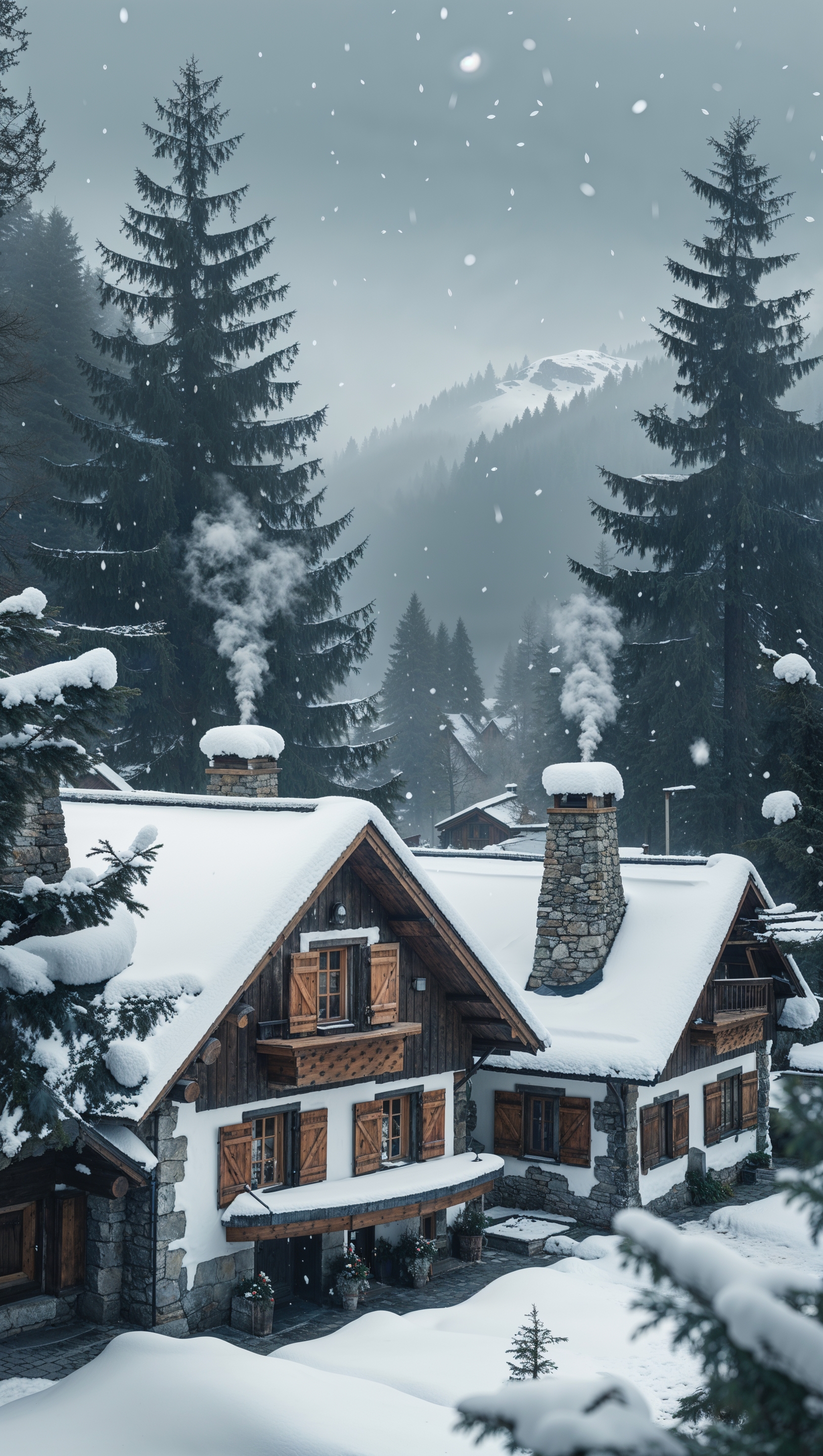 1664x2944 A snowy mountain village with cozy cottages and smoke from chimneys