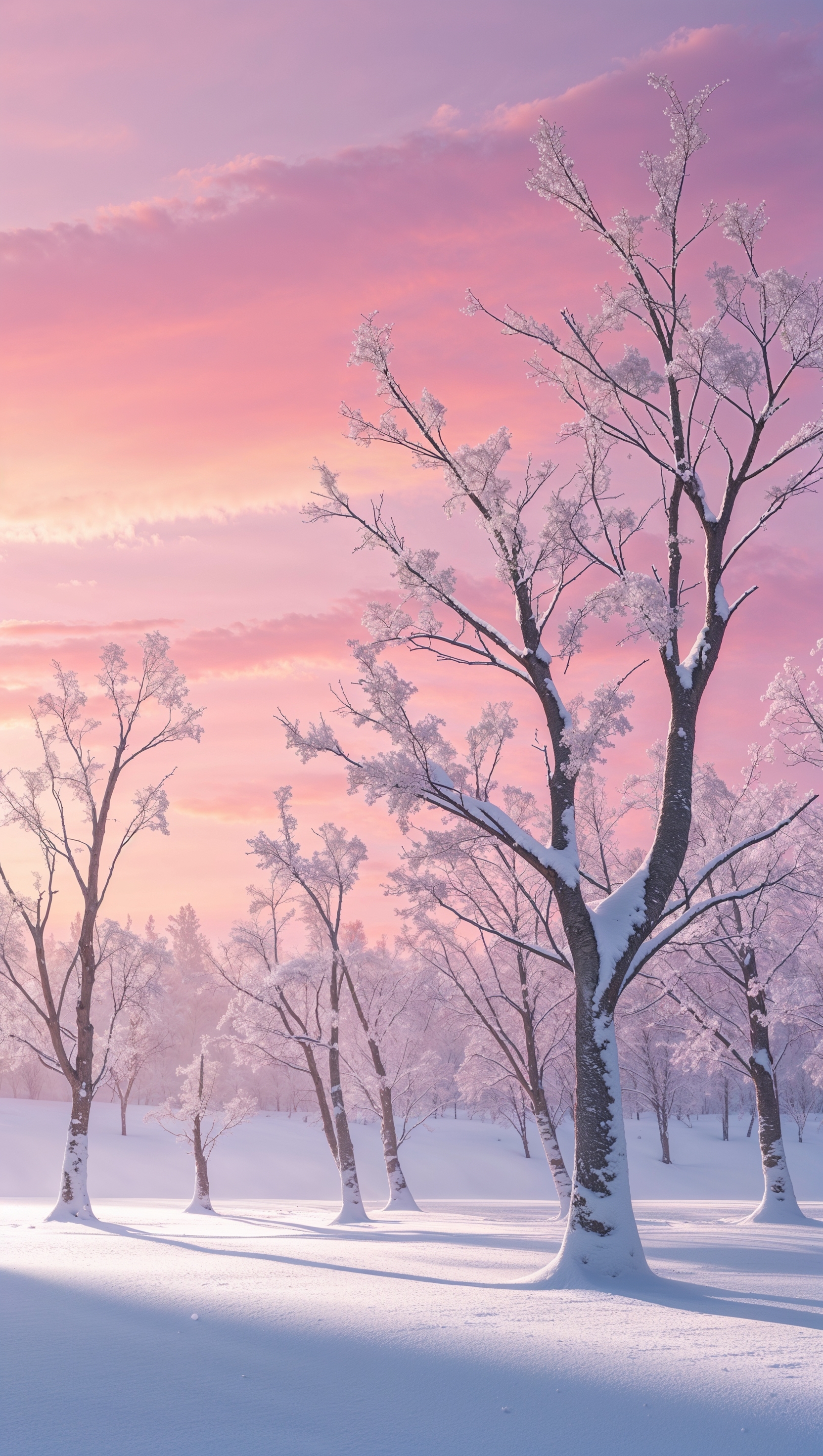 1664x2944 Snow-covered trees under a pink sunset sky