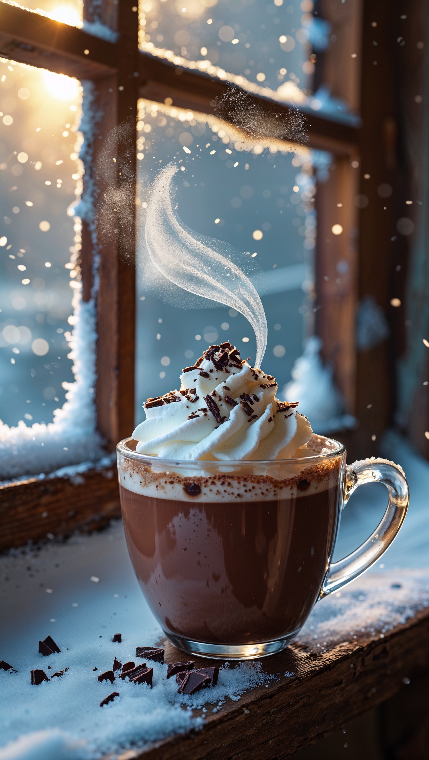 1664x2944 A steaming cup of hot chocolate on a snowy windowsill