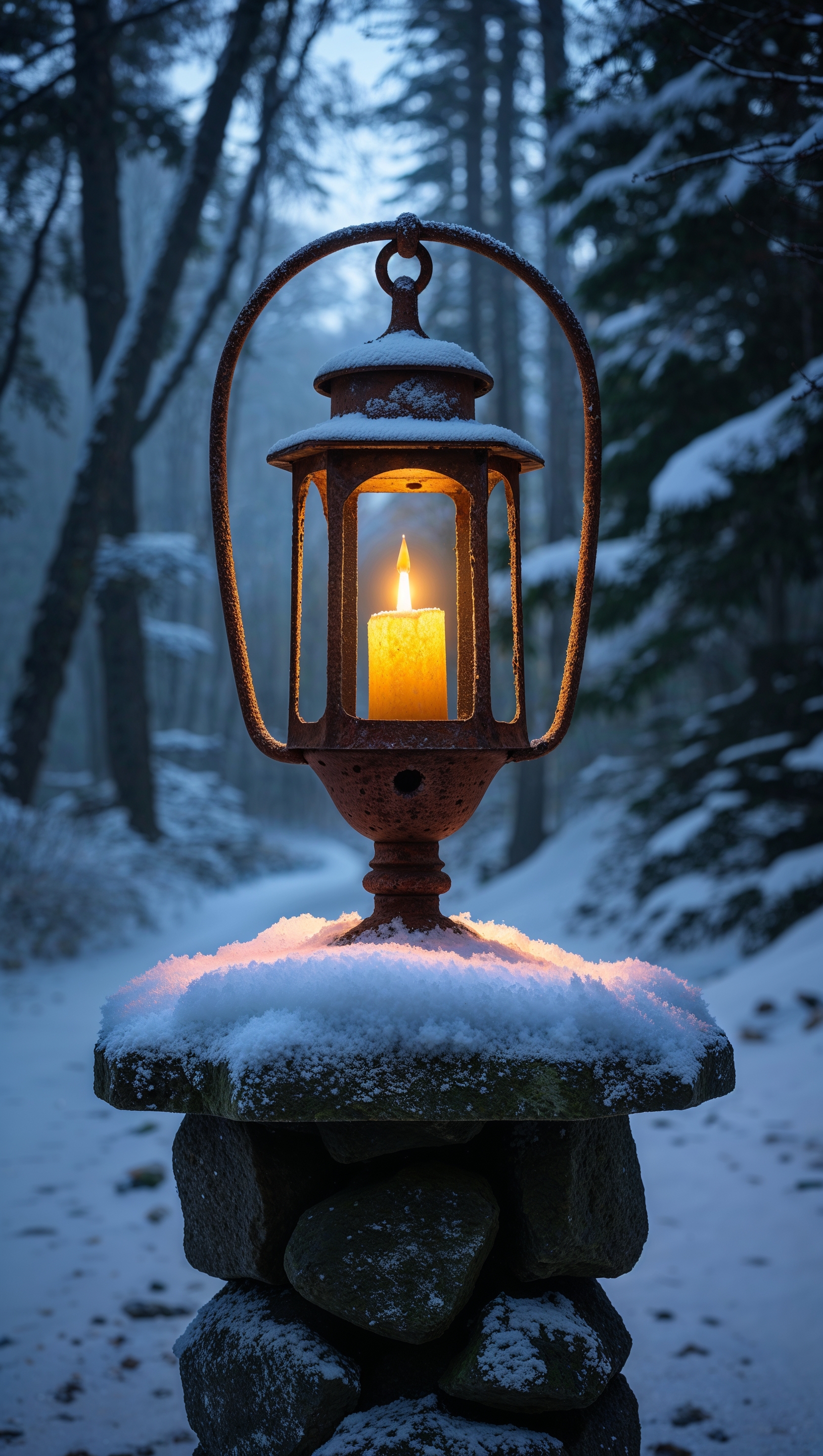 1664x2944 A cozy lantern glowing on a snowy path at night