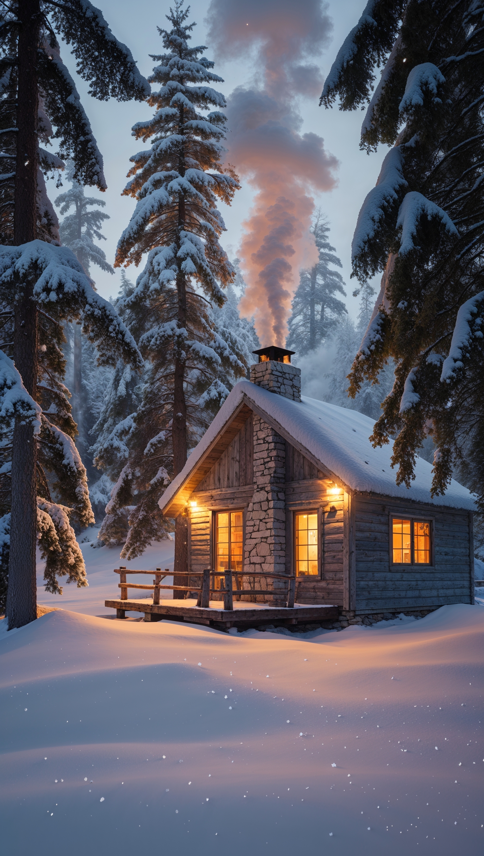 1664x2944 A cozy cabin in the snowy woods, soft lights glowing inside
