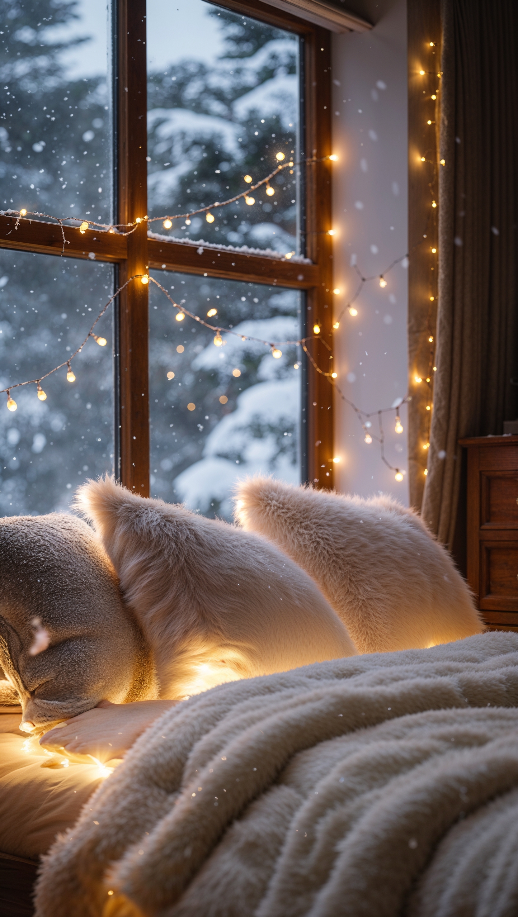 1664x2944 A cozy bedroom with fairy lights and snowy window