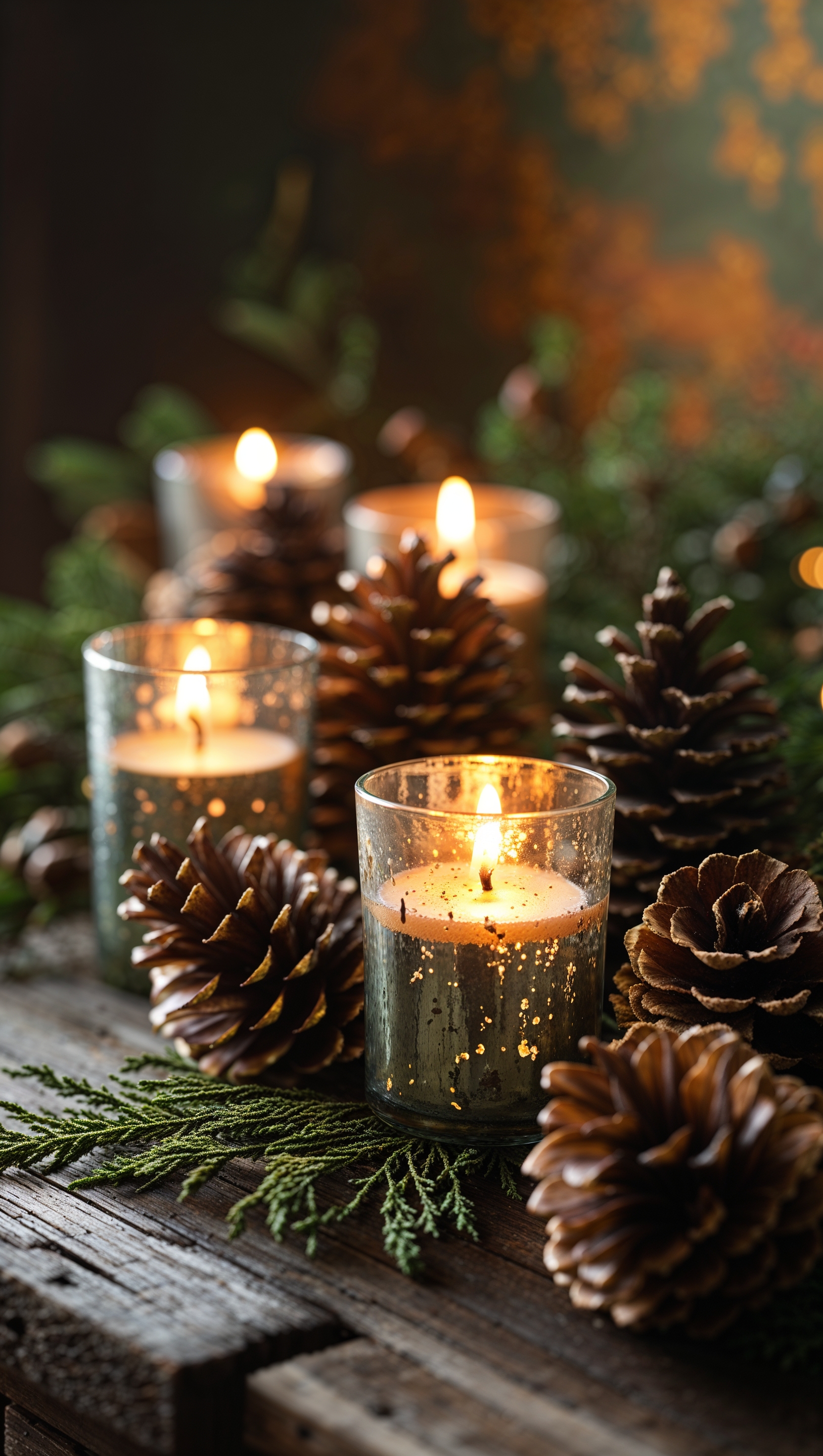 1664x2944 Warm candlelight and pinecones on a wooden table