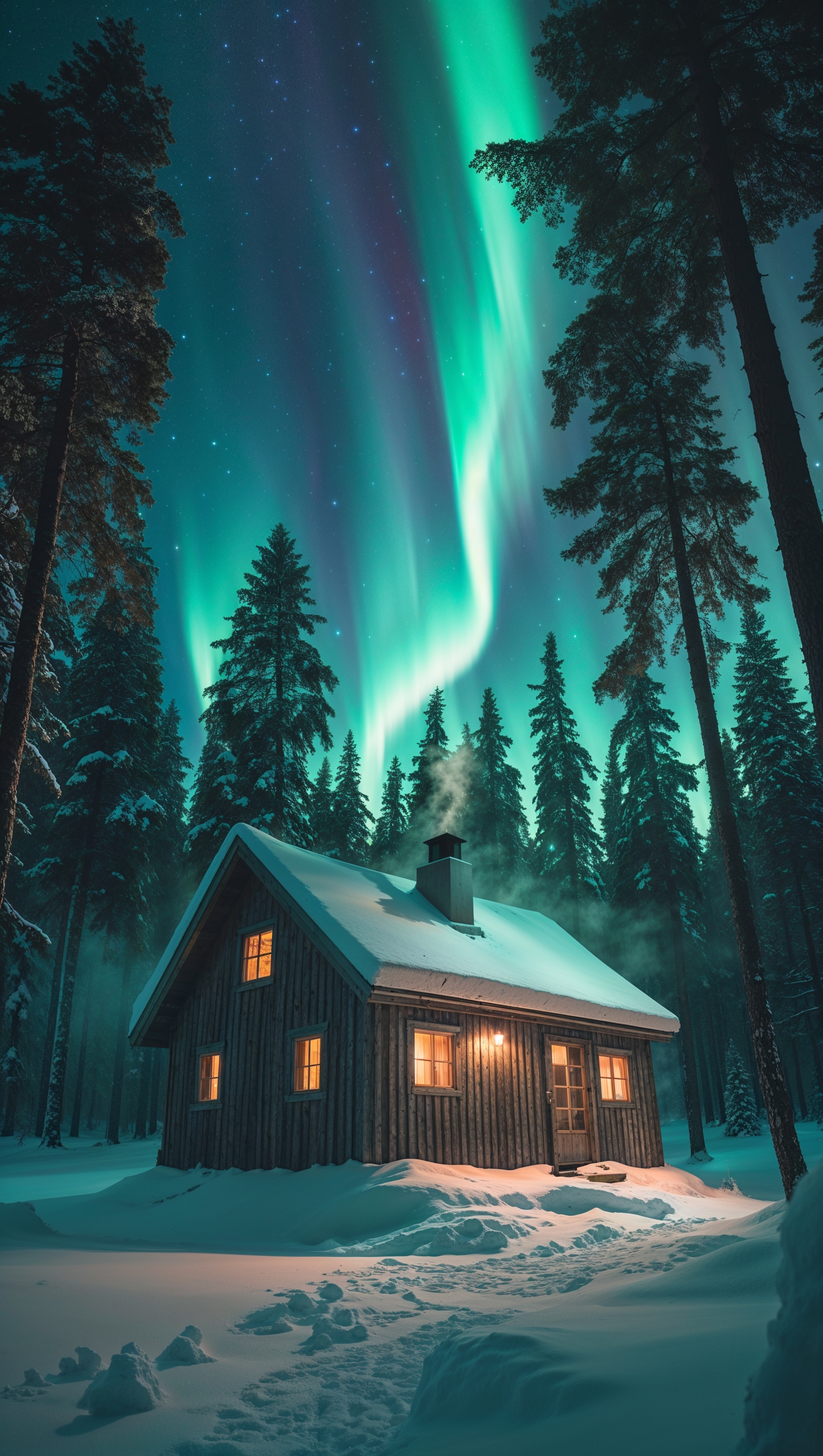 1664x2944 Northern lights over a snowy cabin in the woods