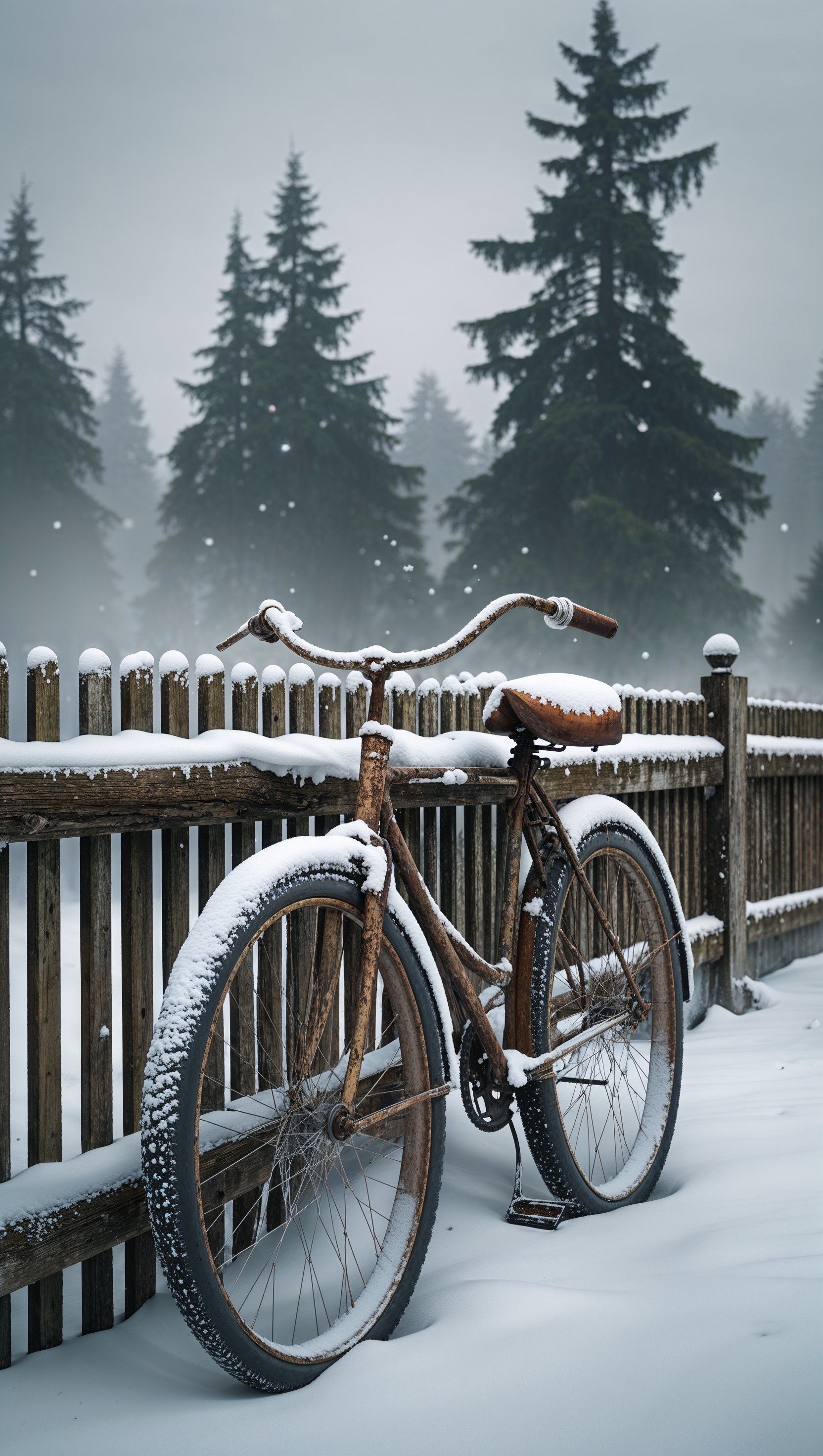 1664x2944 A snow-covered bicycle leaning against a wooden fence