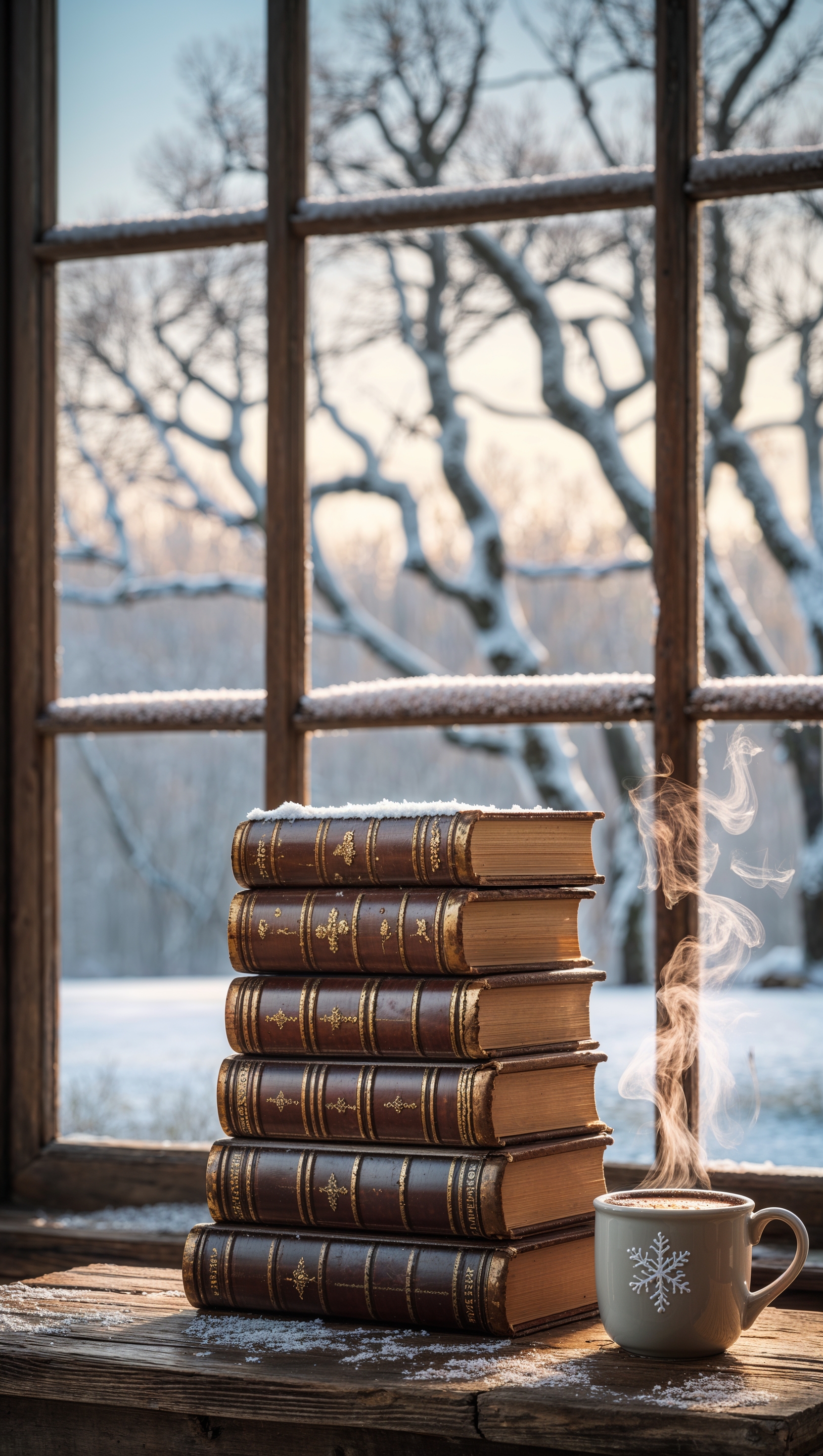 1664x2944 Stack of books, a hot drink, and a snow-covered view outside