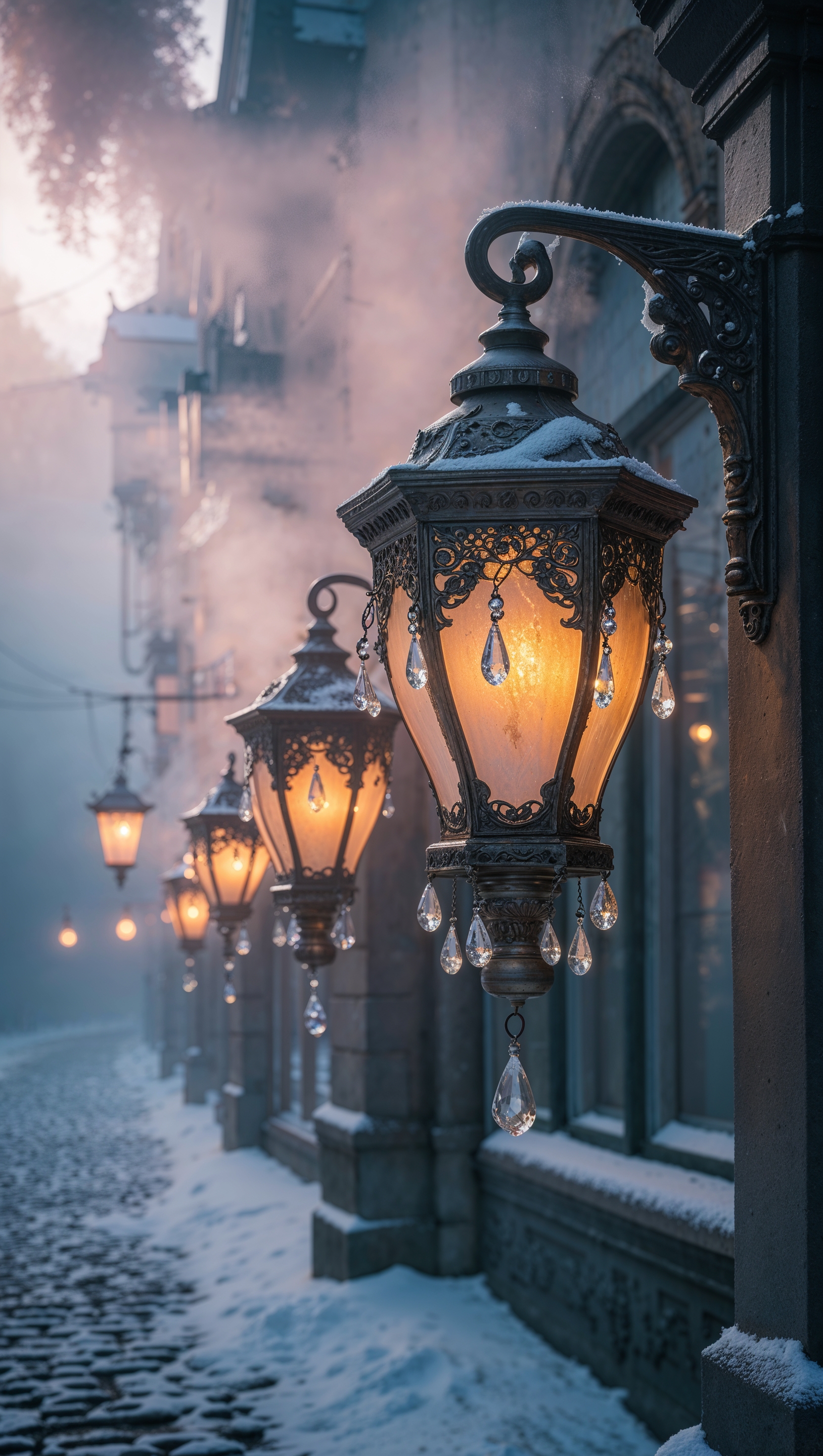 1664x2944 Vintage street lanterns glowing in the snowy fog