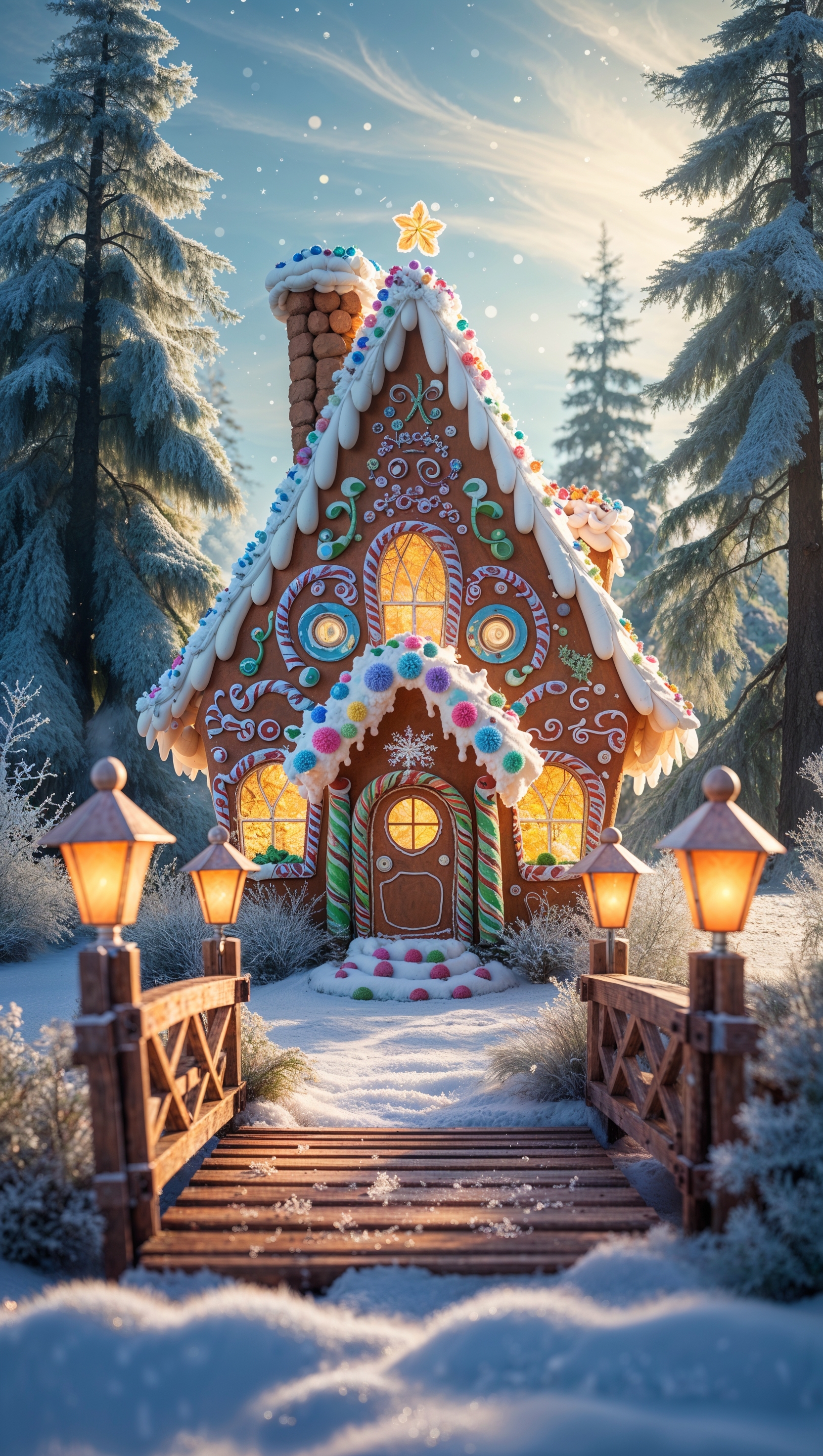 1664x2944 Winter fairytale scene with a cozy gingerbread house