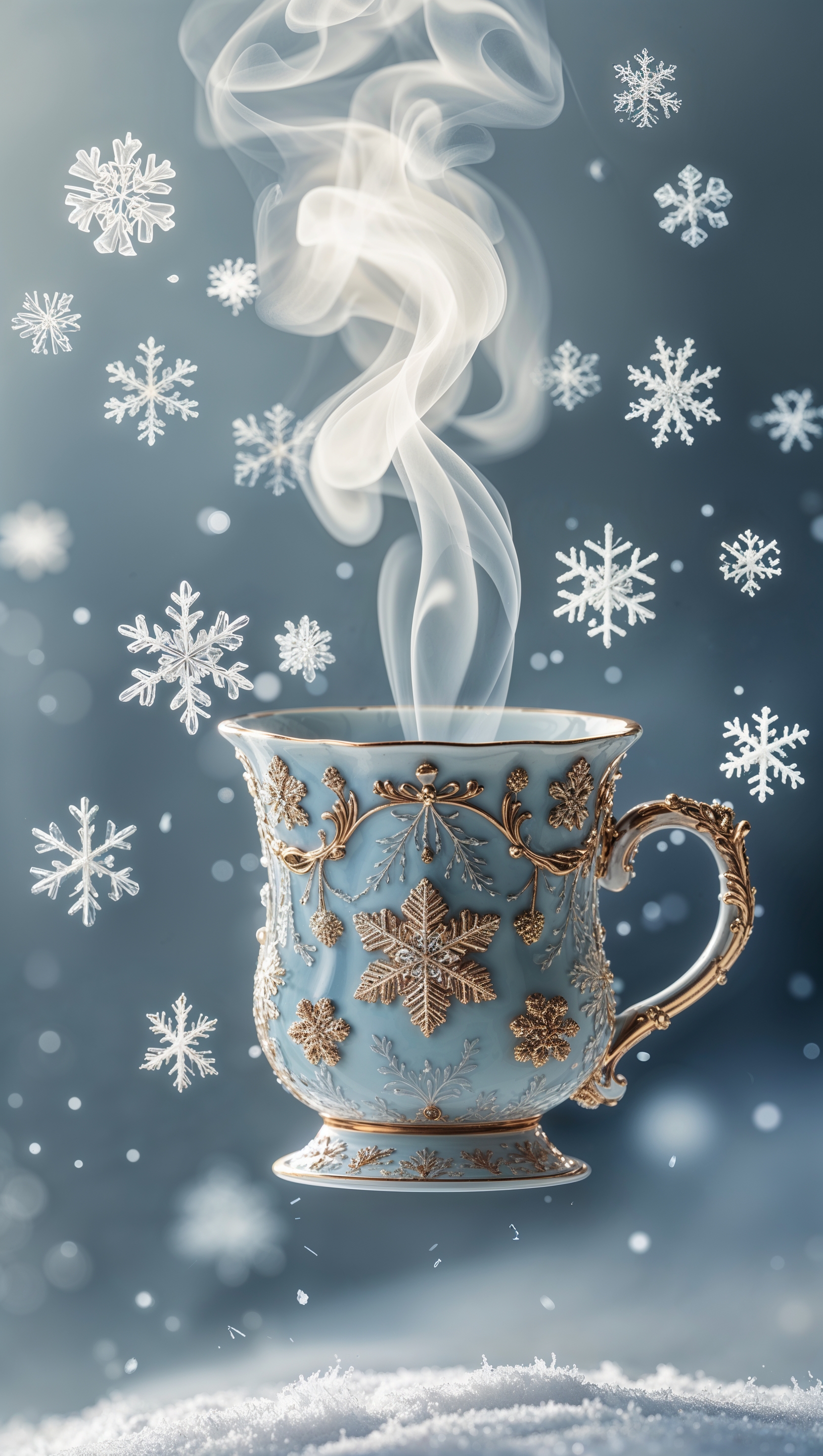 1664x2944 A steaming mug floating in the air surrounded by snowflakes