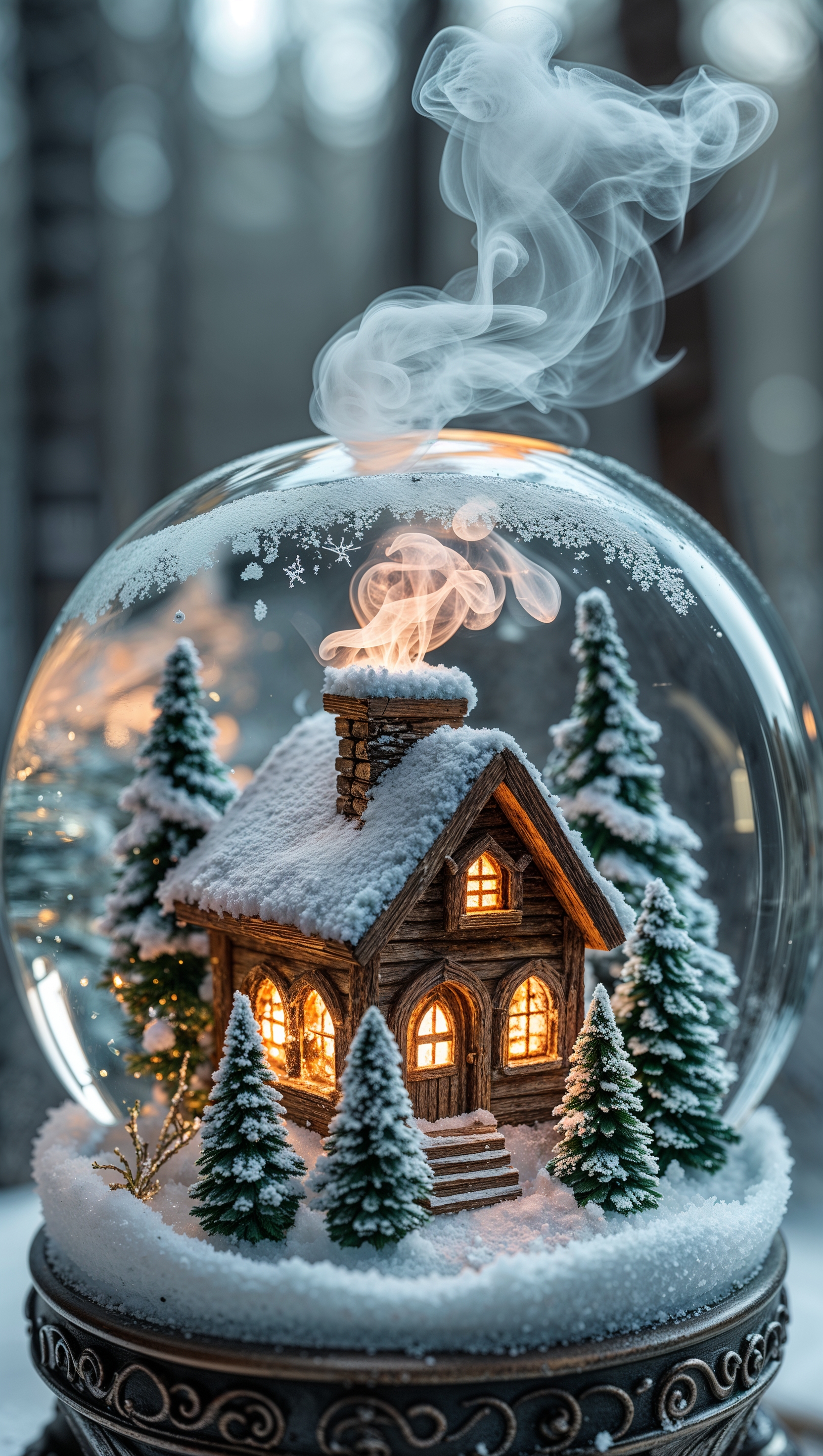 1664x2944 A snow globe with a tiny cabin and swirling snow inside