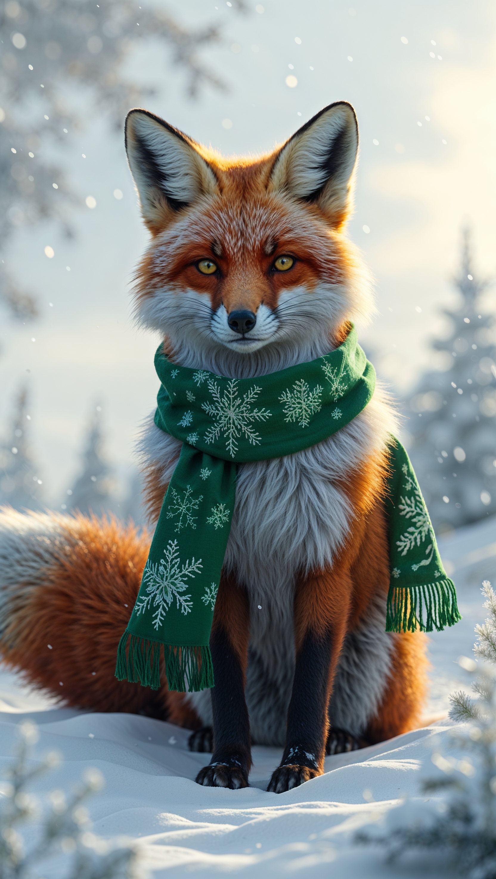 1664x2944 A fox wrapped in a scarf sitting in the snow