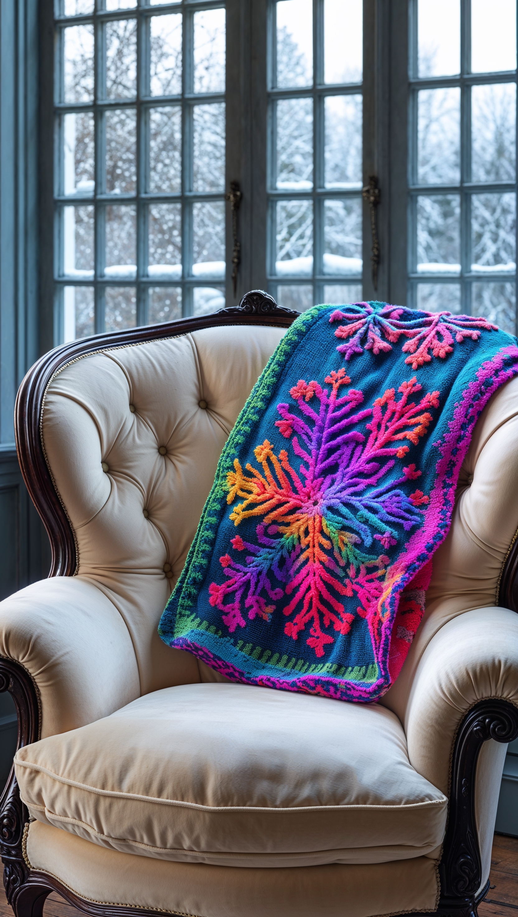 1664x2944 A cozy armchair with a knitted throw and a snowy window view