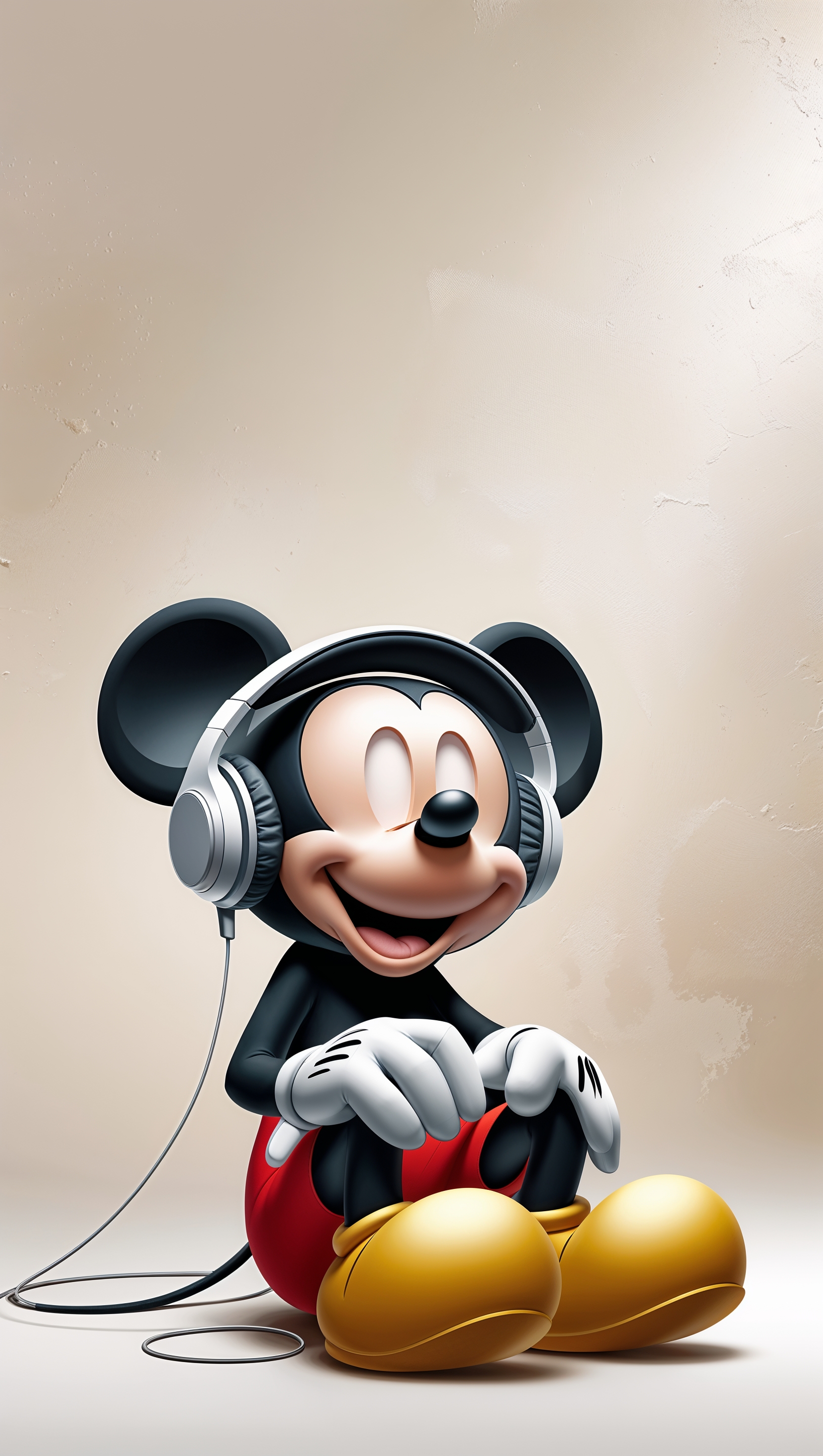 1664x2944 Mickey Mouse listening to music with headphones, light background