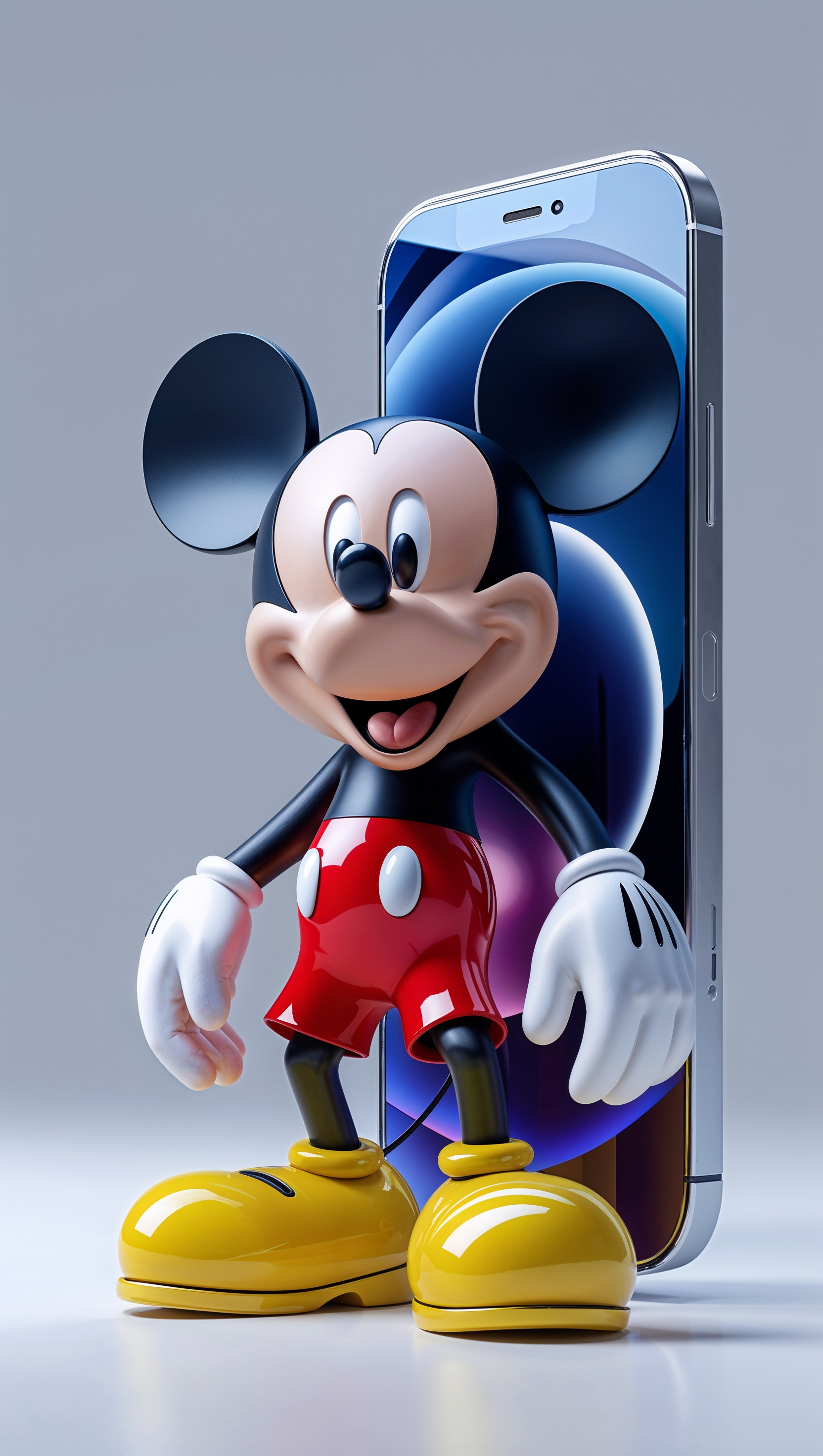 1664x2944 Mickey Mouse next to an iPhone in glossy 3D style