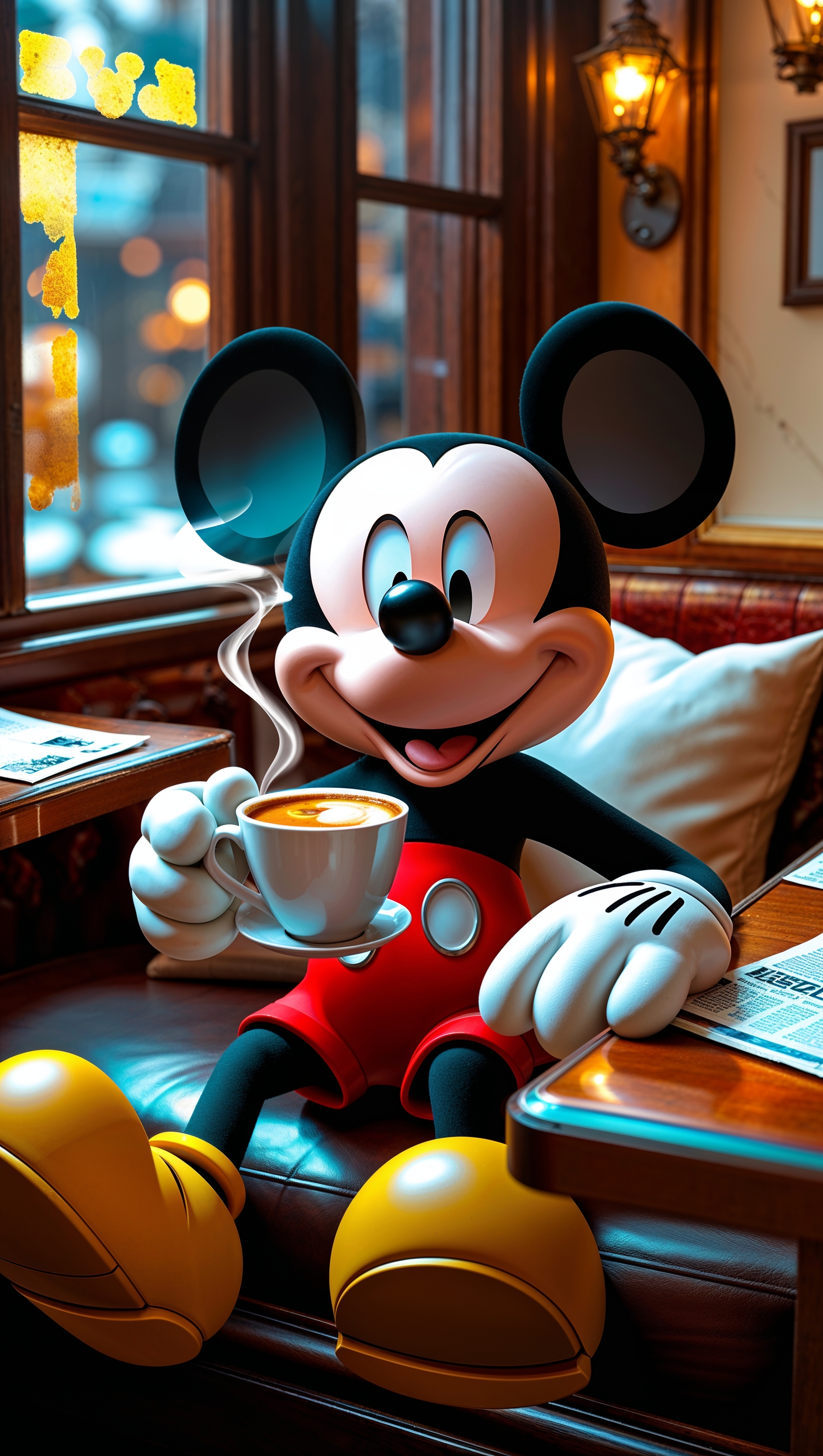1664x2944 Mickey Mouse drinking coffee in a cozy cafe