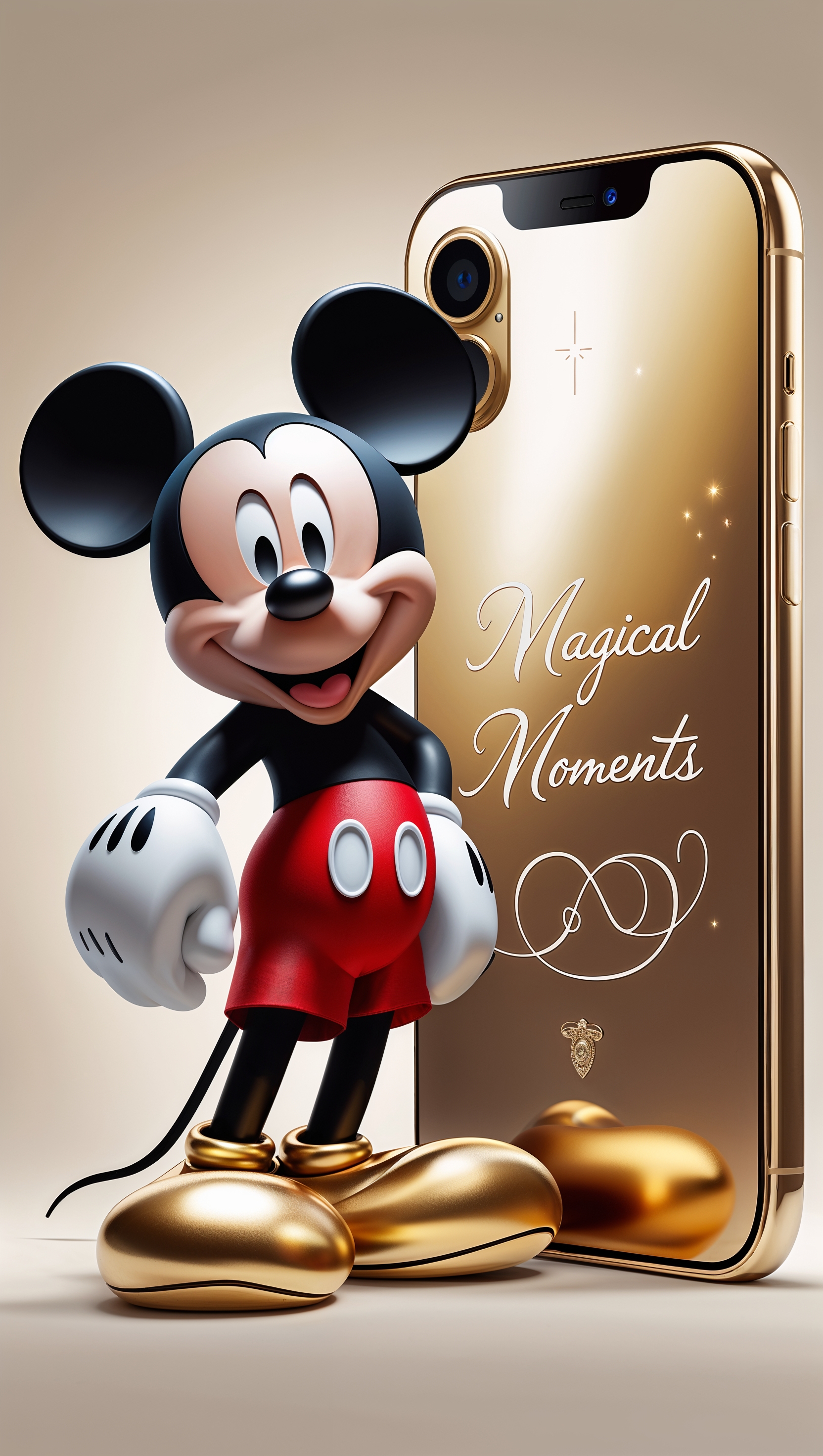 1664x2944 Mickey Mouse next to a golden iPhone, luxury design