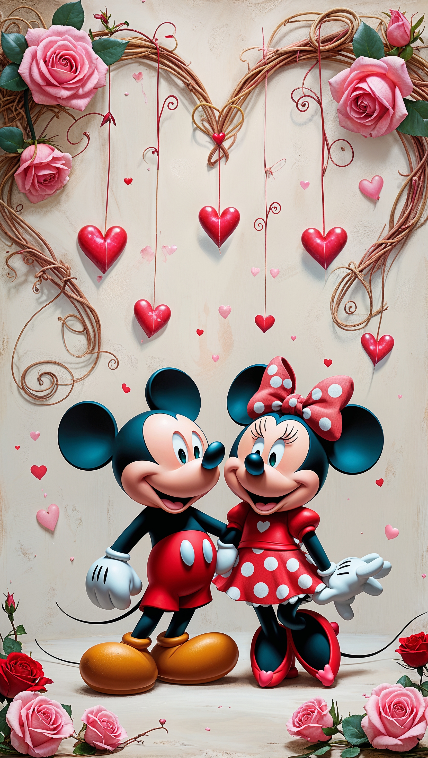 1664x2944 Mickey Mouse and Minnie Mouse with romantic and heart-themed design