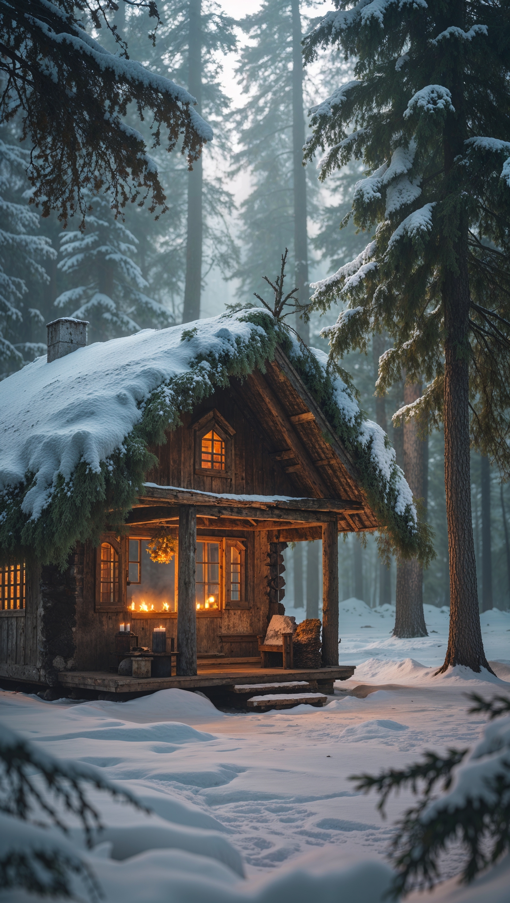 1664x2944 Wooden cabin in the middle of a snowy forest