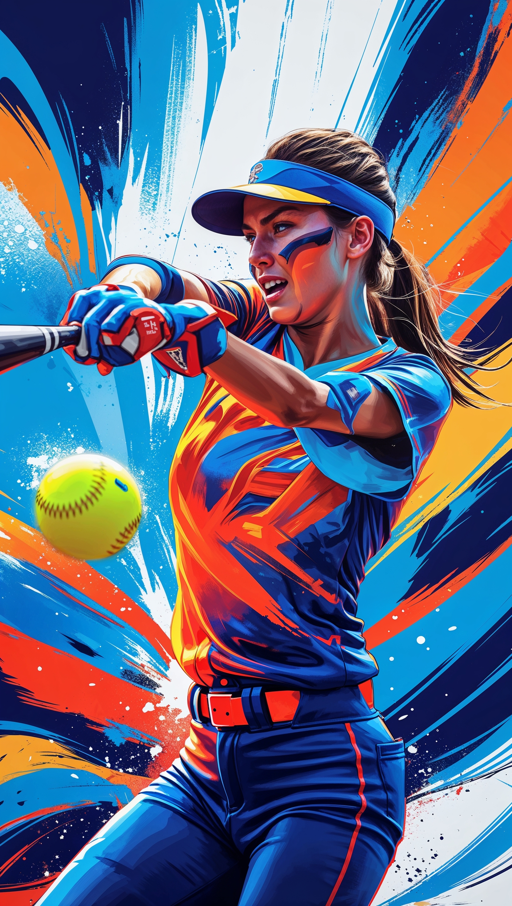 1664x2944 A dynamic softball player hitting the ball, colorful background, perfect for iPhone wallpaper