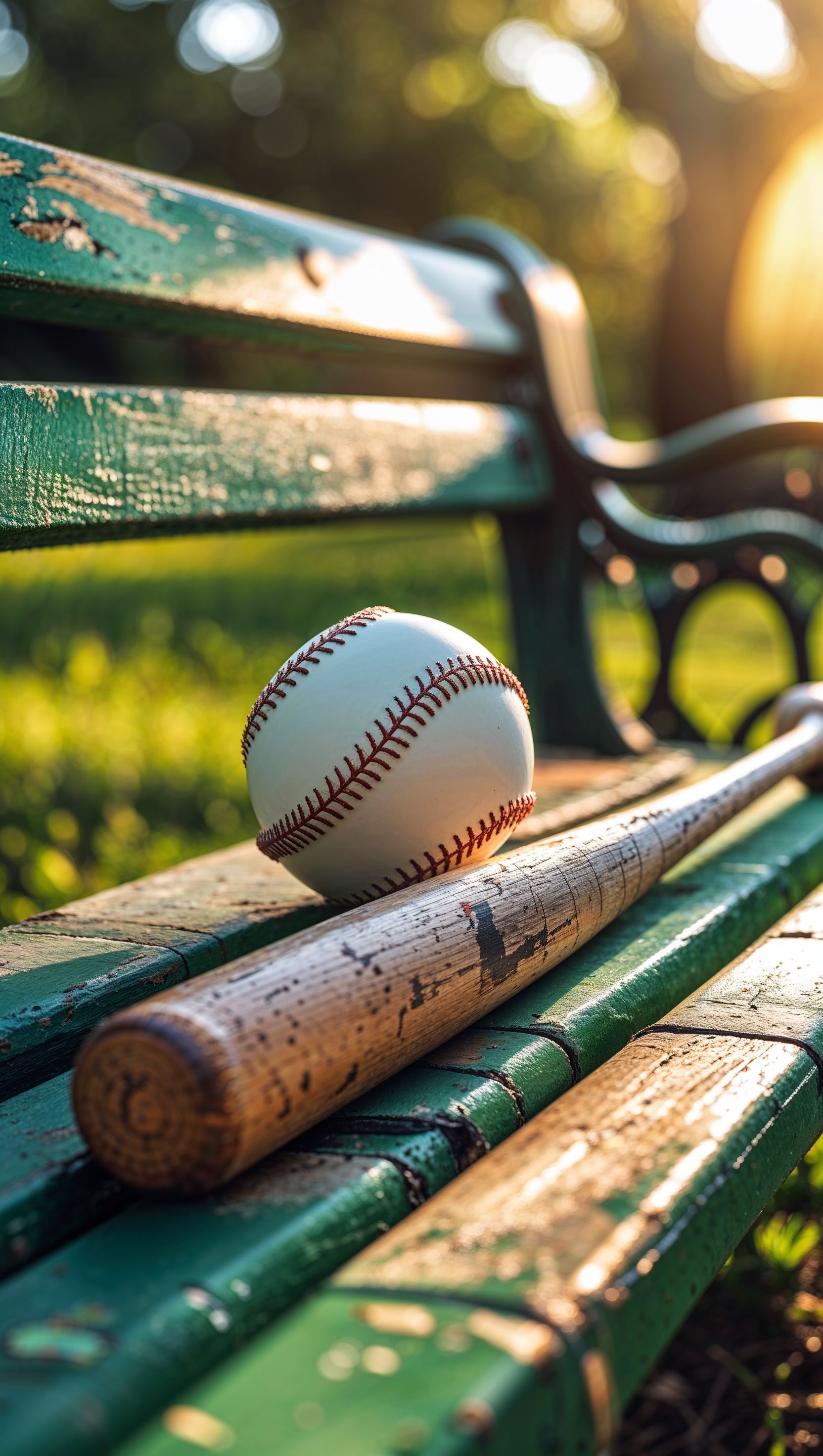1664x2944 Softball bat and ball resting on a bench, sunny afternoon vibe, iPhone wallpaper