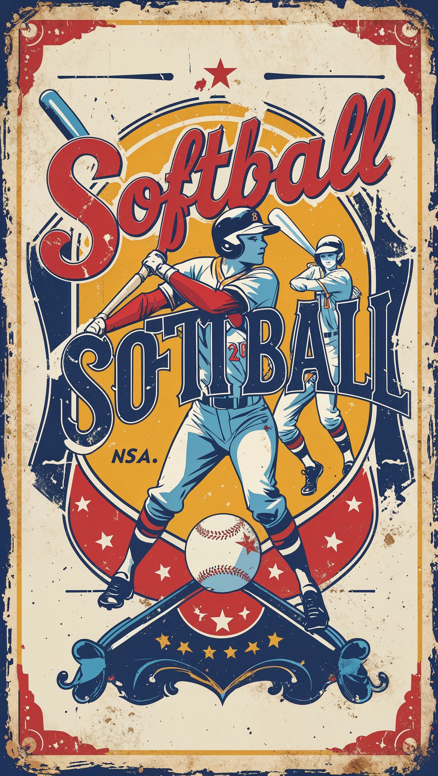 1664x2944 Vintage softball poster art, retro colors, nostalgic style, iPhone wallpaper