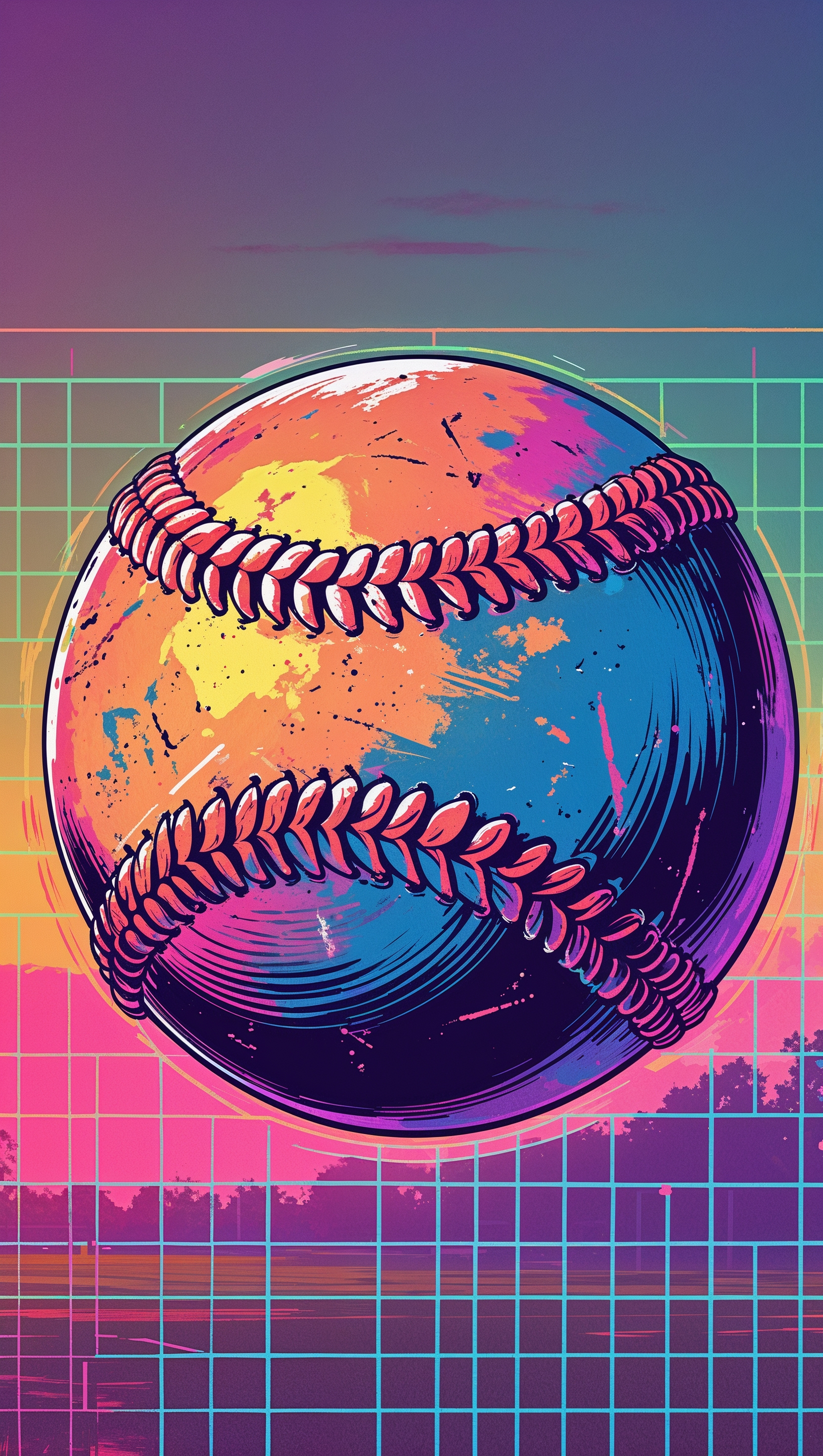 1664x2944 Retro 80s themed softball art with neon grids and sunset, iPhone background