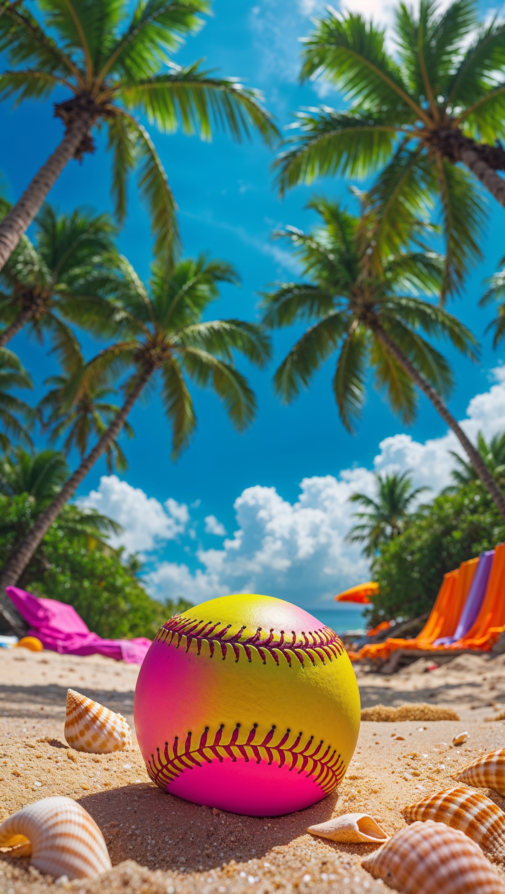 1664x2944 Softball on a beach, tropical summer vibes, bright colors, iPhone wallpaper