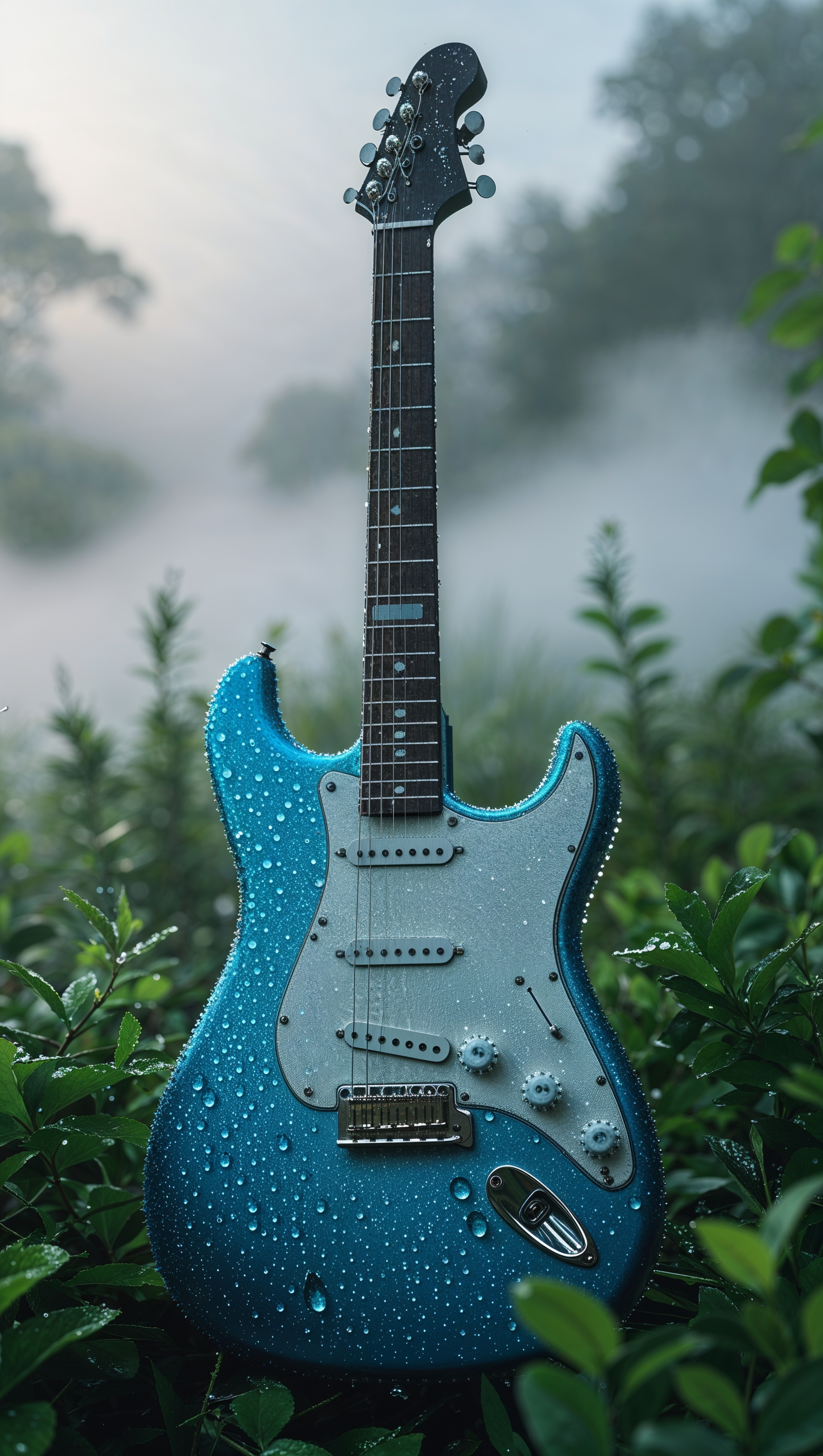 1664x2944 Shiny blue guitar in morning mist, iPhone background