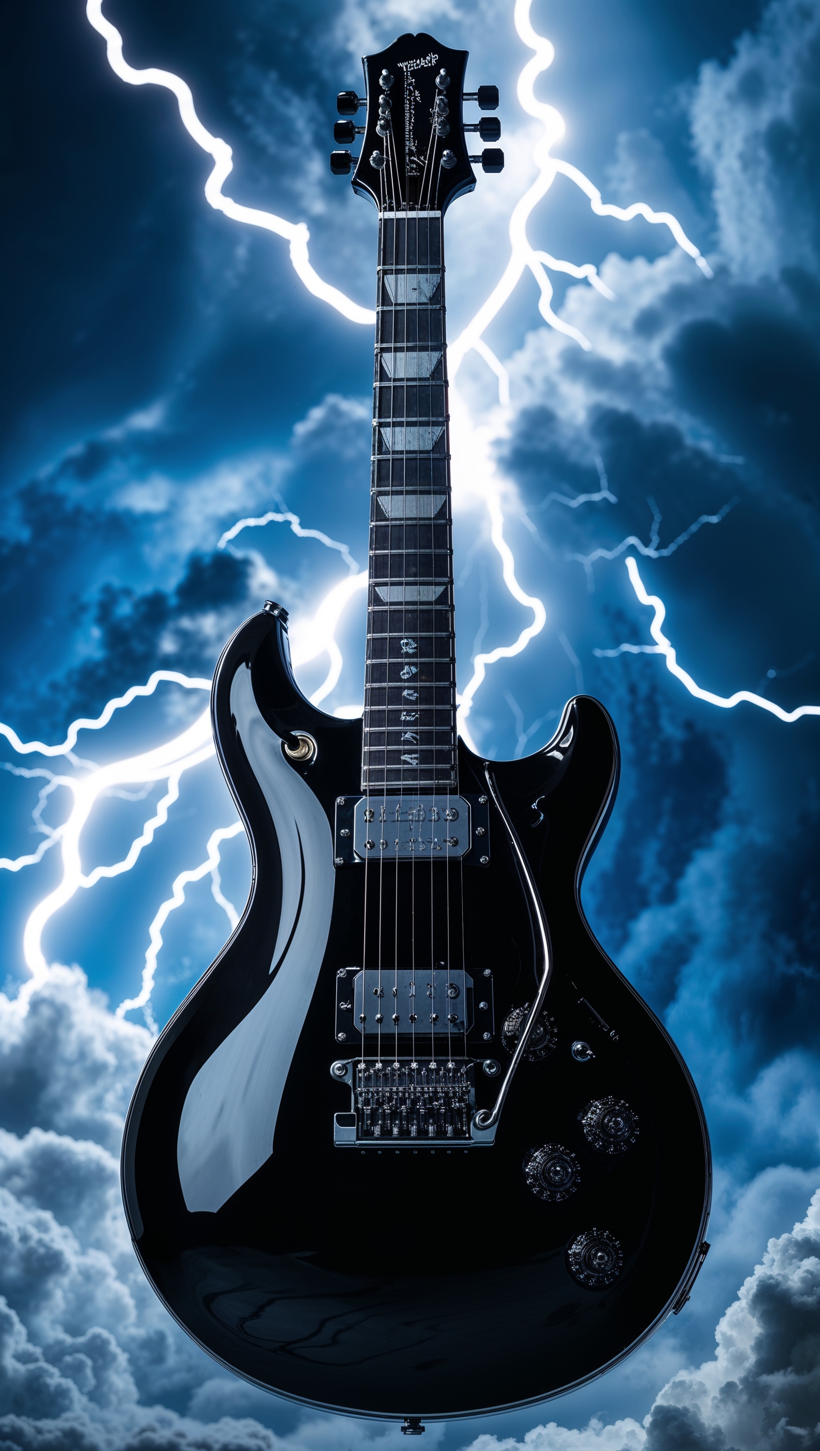1664x2944 Black electric guitar with lightning background, iPhone wallpaper