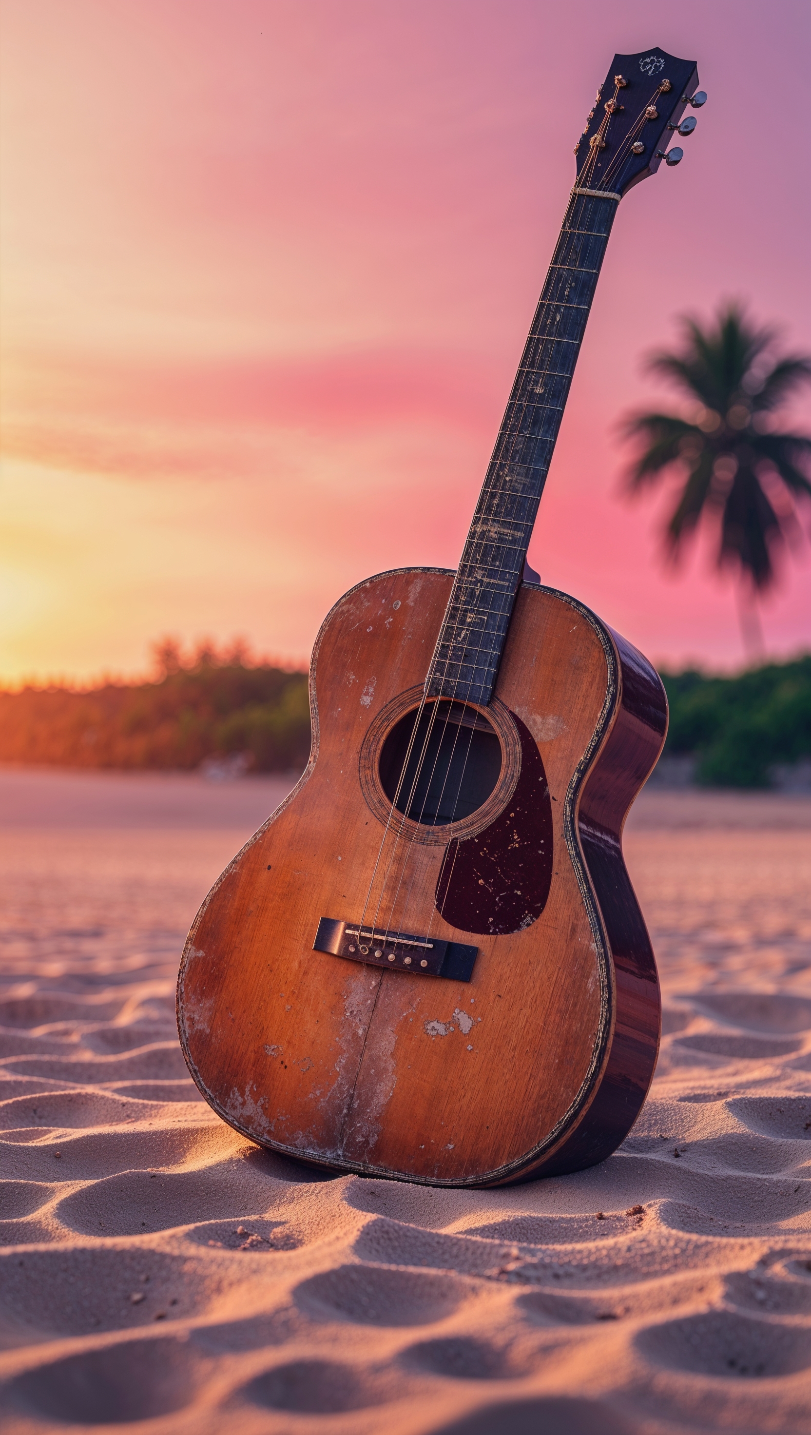 1664x2944 Guitar on a sandy beach at sunset, mobile background