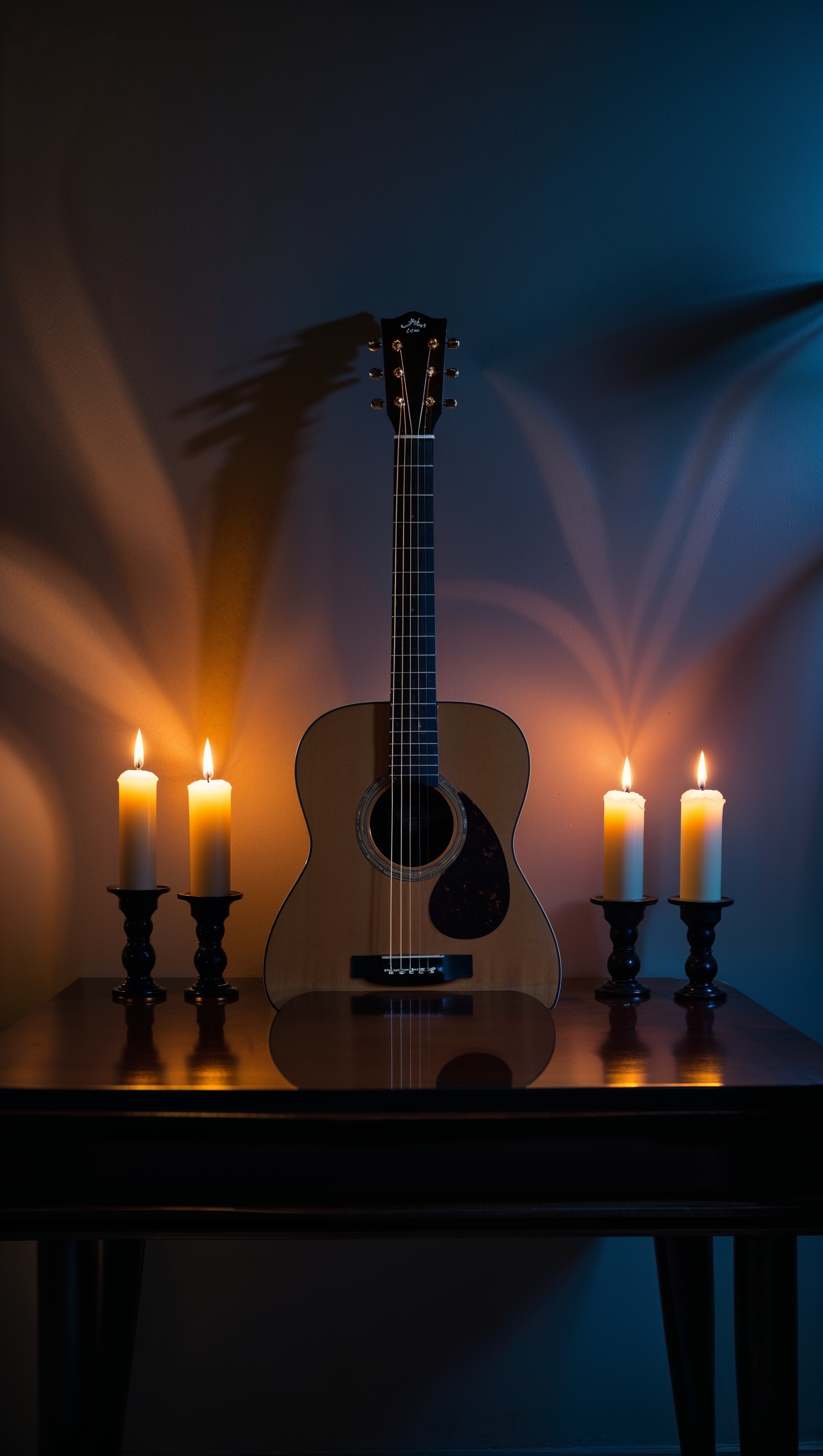 1664x2944 Guitar beside lit candles at night, iPhone wallpaper