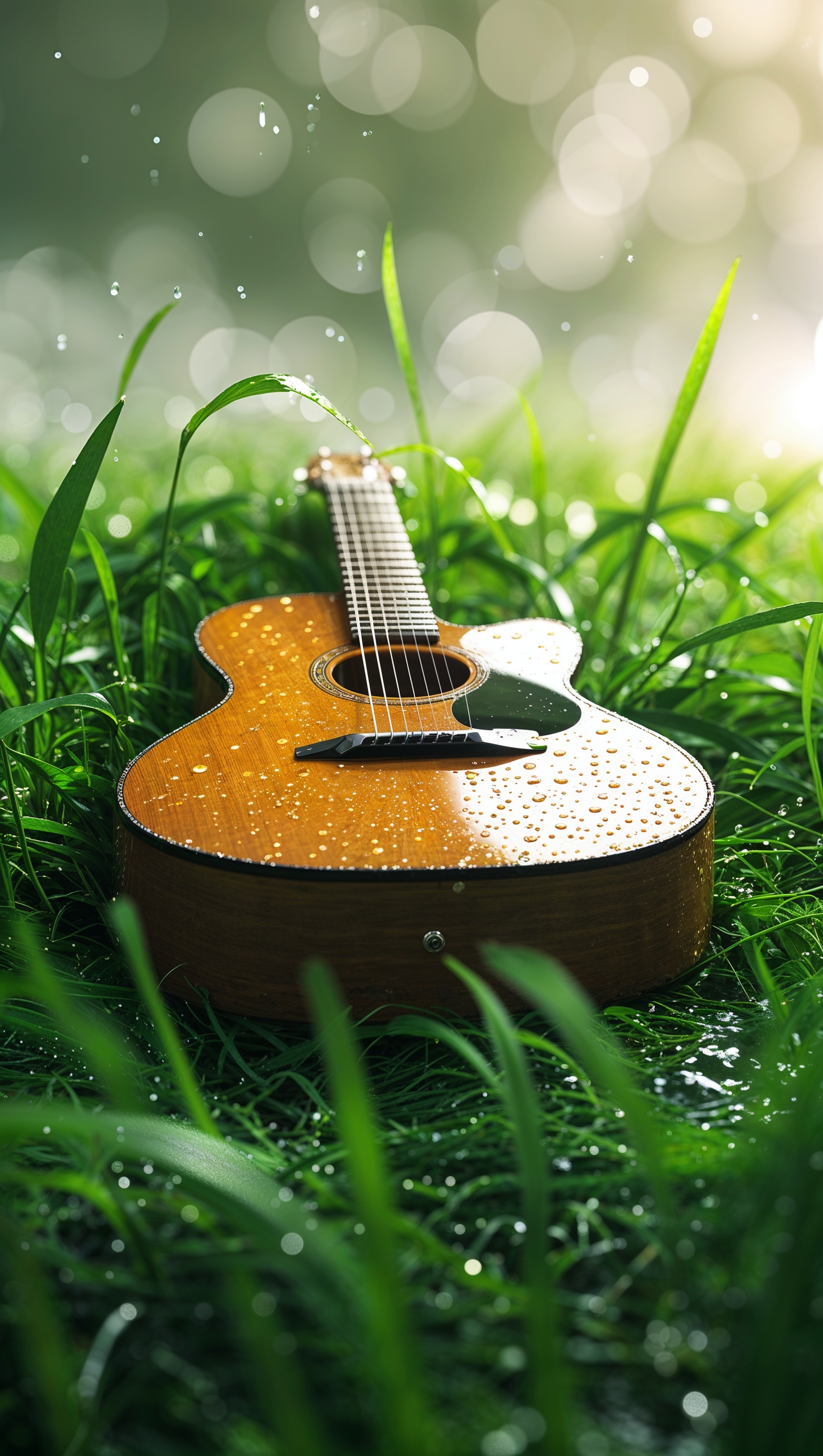 1664x2944 Acoustic guitar on wet grass, iPhone wallpaper